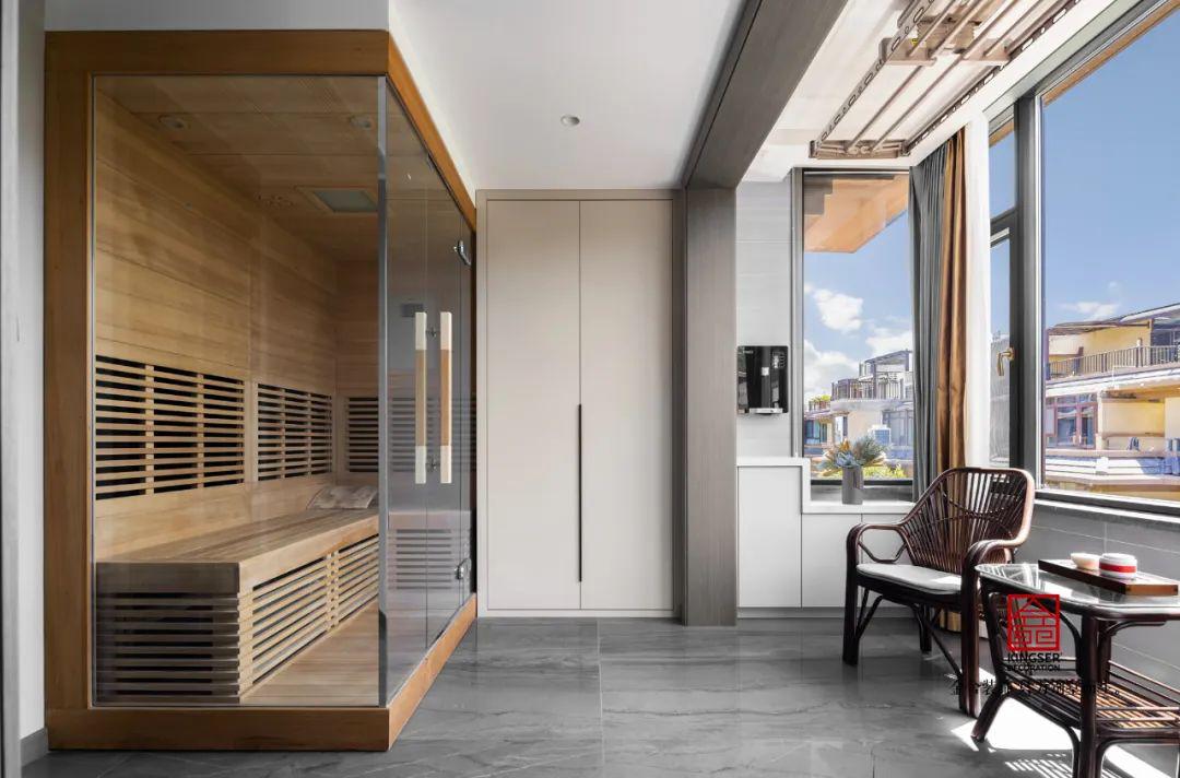 二樓通過功能分區實現臥室空間的最大化利用,主臥采用雙床錯位布局提升睡眠舒適度,床頭背景墻以水波紋理裝飾營造沉浸式睡眠氛圍。內部獨立設置桑拿房與休閑陽臺,通過玻璃隔斷實現干濕分離,既滿足養生需求又延伸休閑功能。