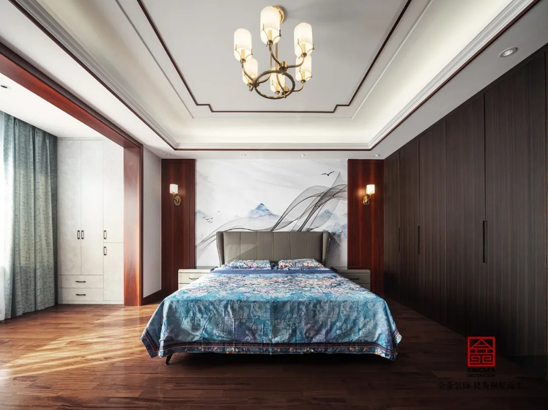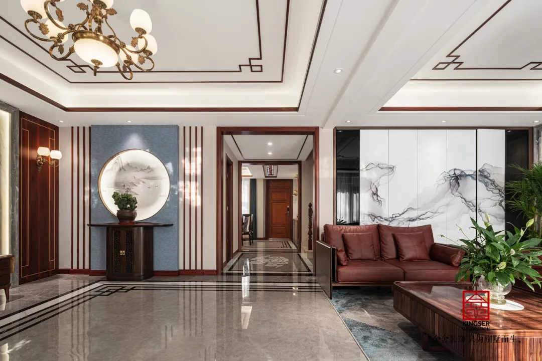 此案例為金舍裝飾-大者別墅300平米新中式風格裝修實景。繽紛的世界,滿眼的山色。時常仰慕古人,可以把顏色分得如此細膩,連名字也起得那般富有詩意:翠為山色,碧為湖色,丹是云霞升騰。顏色,是渾然天成的畫,是生活經驗凝結成的詩,人們一見名字,便心領神會,在腦里生出了意境。