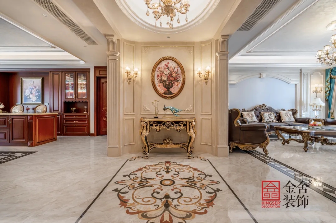 精致細膩的黑金色雕花玄關柜,佐以大理石洛可可式的石材線條效果,再加上地面的忍冬草紋飾的花磚,更是讓整個空間充滿了優雅古典的氛圍。