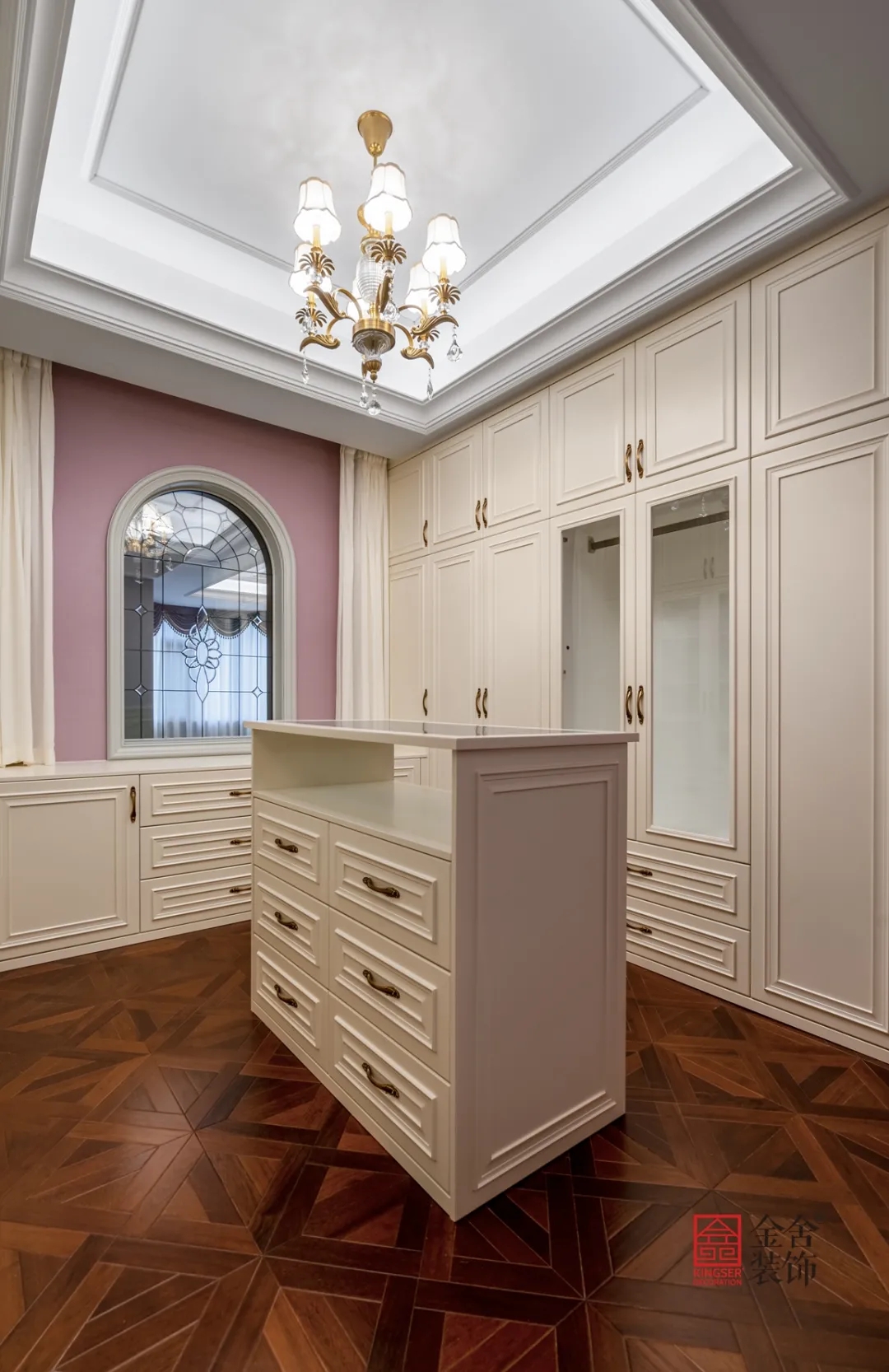 主臥是個套間。衣帽間,書房,主臥三位一體。色彩呈現依舊用寶藍色的窗簾與棕褐色的家具形成對比,歐式傳統的金屬吊燈則起到畫龍點睛的作用,置身其中,舒適、溫馨的感覺襲人,讓心靈找到了歸宿。