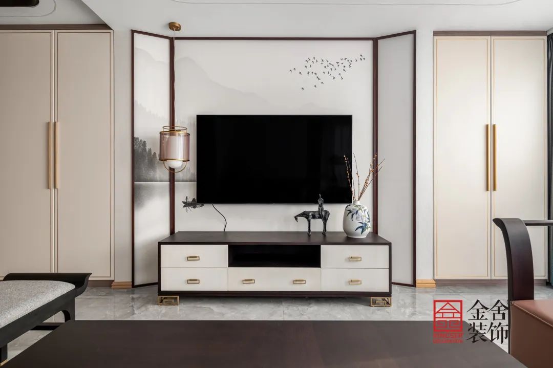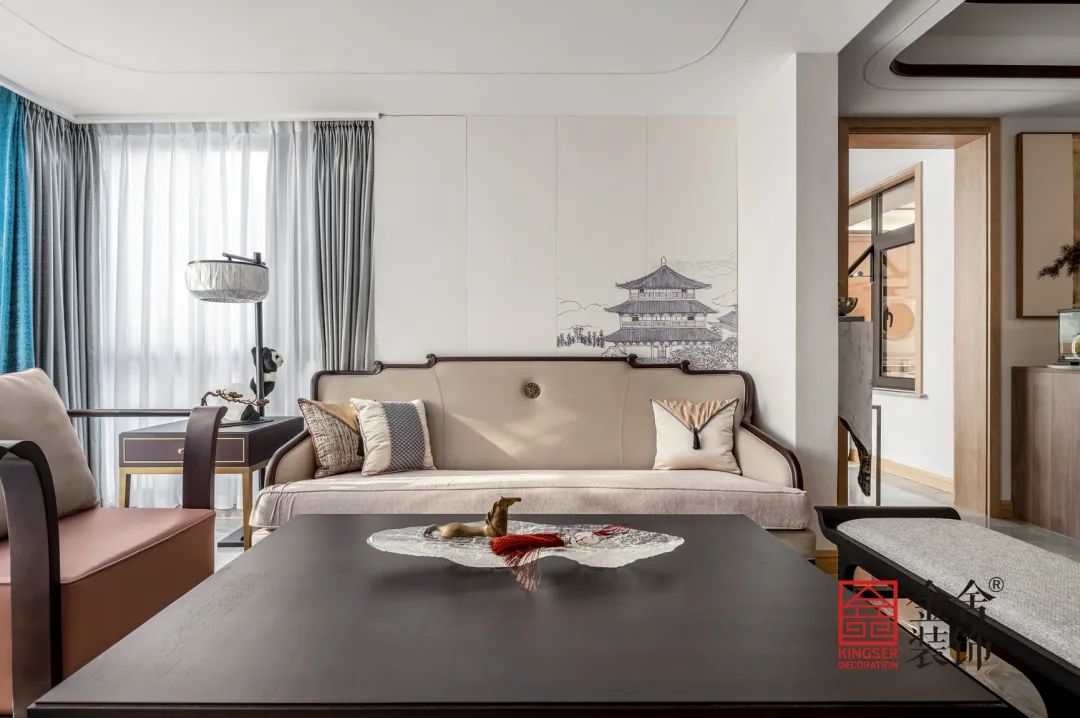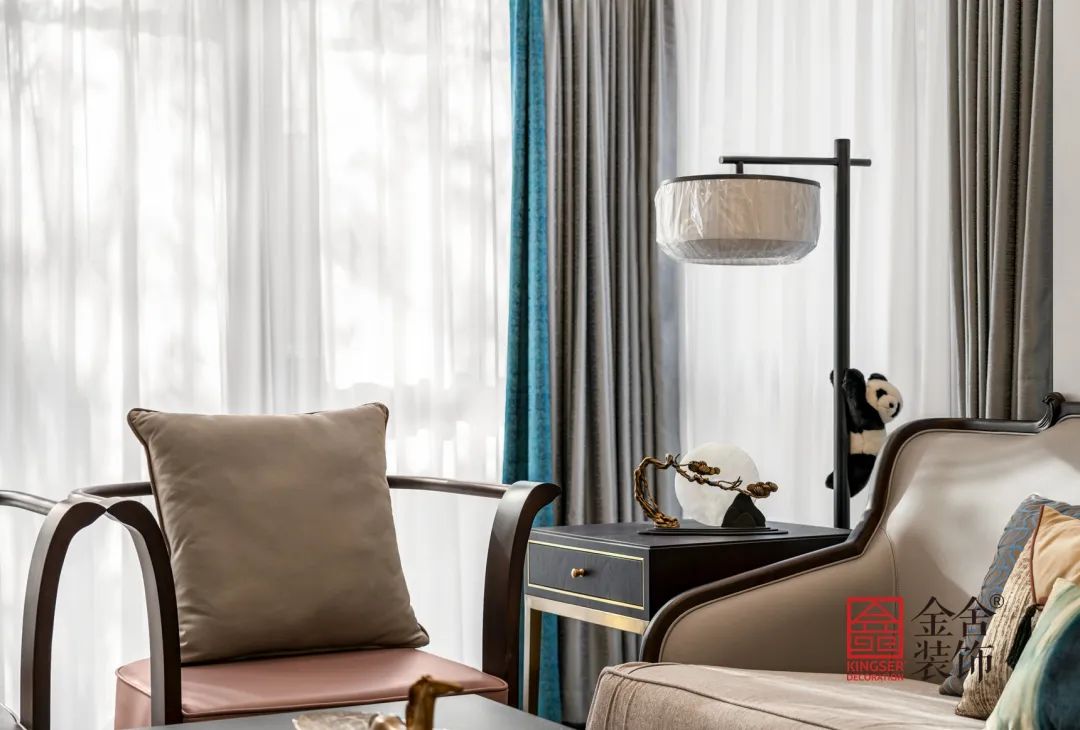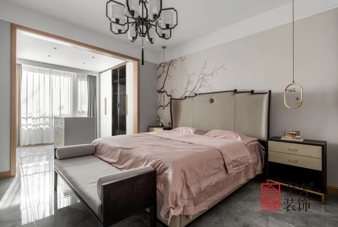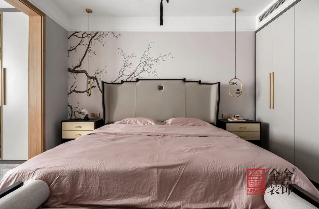 臥室以白、灰、深咖等素色為主,整體色調較之公共區域更添幾分清新自然;日光透過層層窗帷,自在穿梭間,照見一室典雅,寫意風流。清新的古風床頭背景墻面裝飾,給人一股淡雅悠揚的感覺。