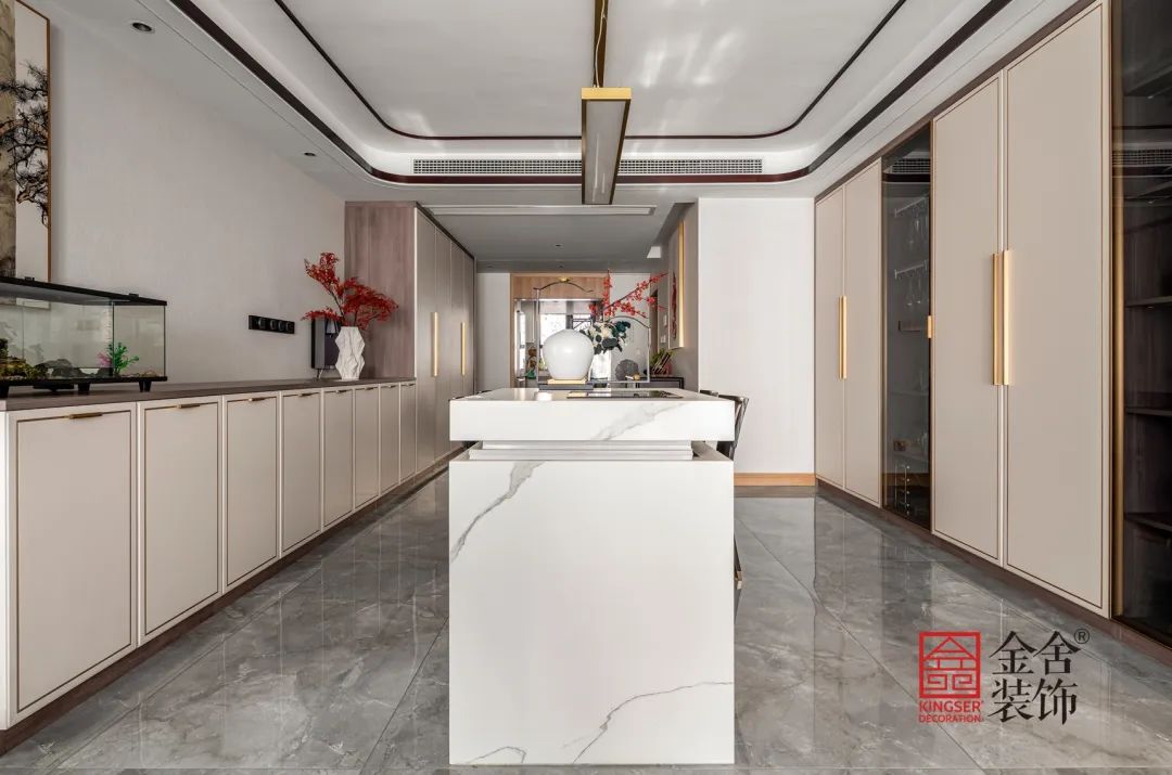 餐廳通過中島臺的設計增加了整個空間利用率,讓本身不是很寬敞的空間得到了最大限度的利用,整面墻做了一排通頂的柜子,保證了收納和實用的功能。