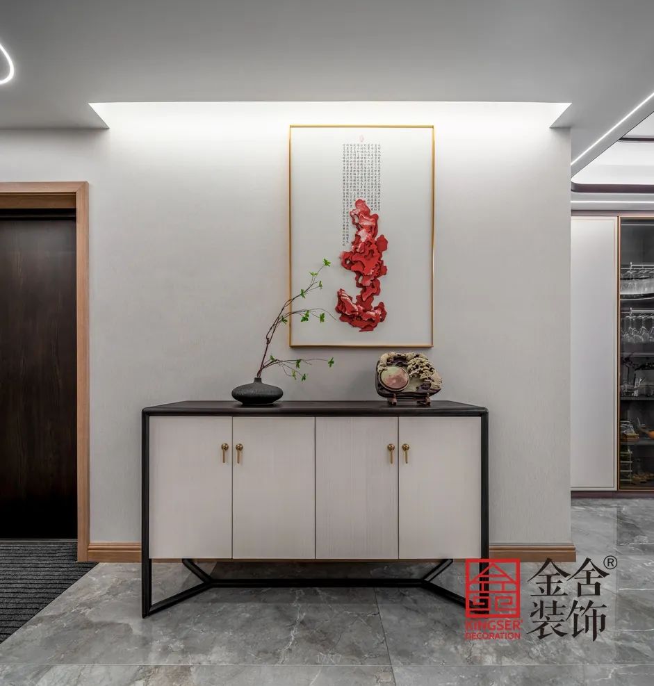 美玉、虬枝、太湖石,玄關將中式風格中的人文風骨都顯現了出來,人品如美玉無暇溫潤,韌性如虬枝不為強風所屈服,以及對于太湖石自然之相“天人合一”的推崇,可以說這單單一方天地便露出東方文人的風骨。