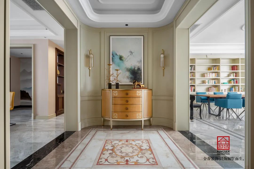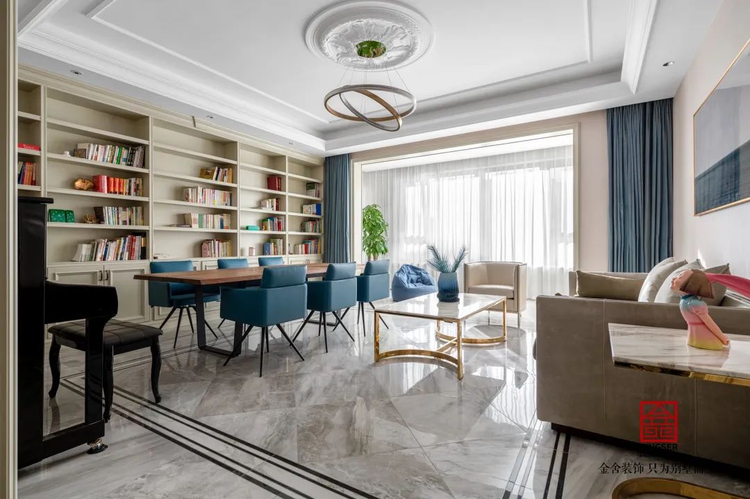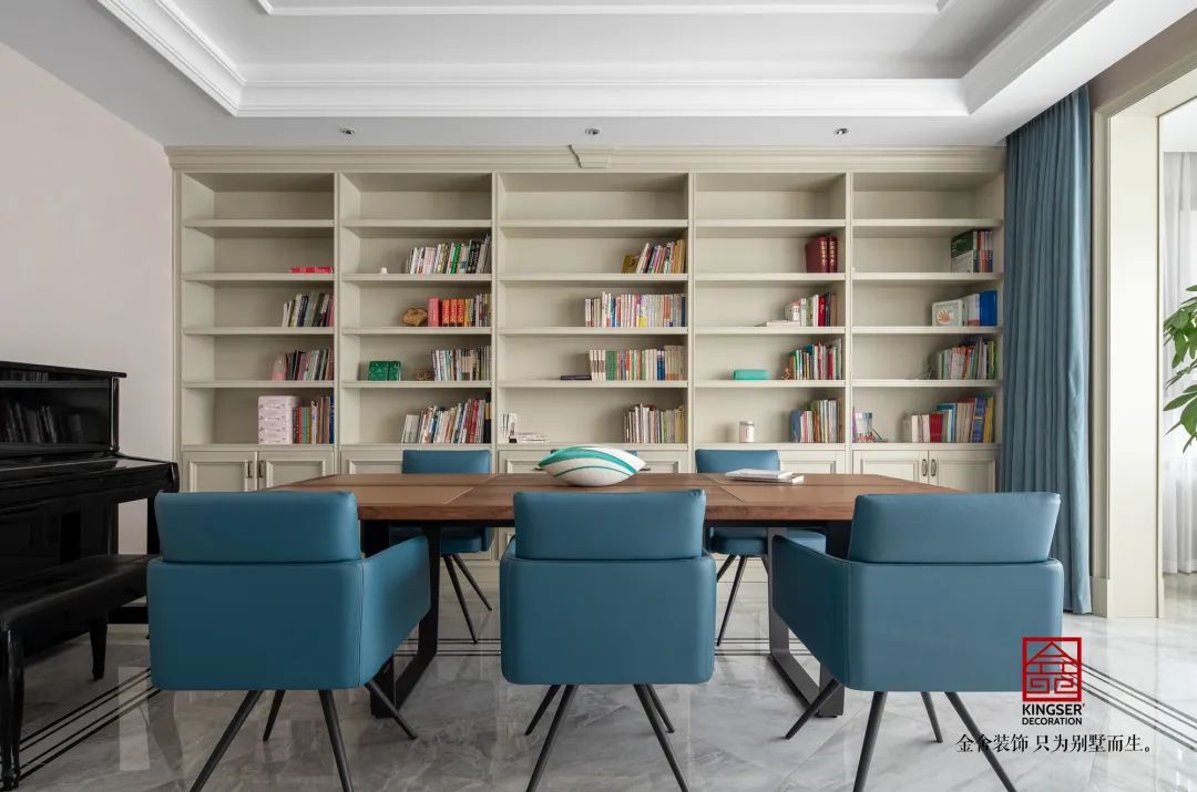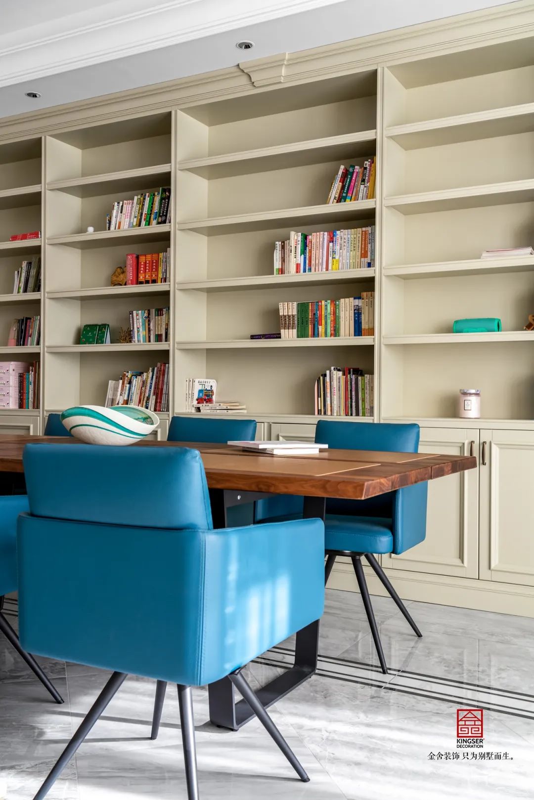 此案例為石家莊室內裝修-榮盛華府200平米美式風格裝修案例實景。博爾赫斯曾經說過:我心里一直在暗暗設想,天堂應該是圖書館的模樣。在家庭圖書館中,隨手捧起一本好書,沉浸在文字的世界里,與聰明人進行精神交流,這或許就是天堂應該有的模樣。
