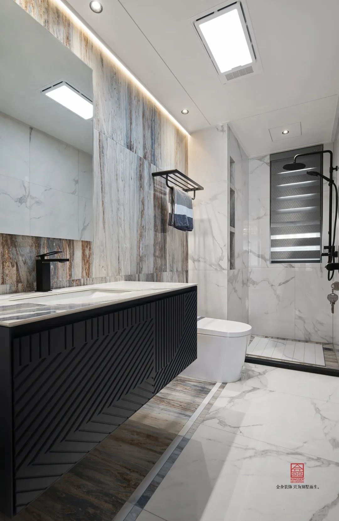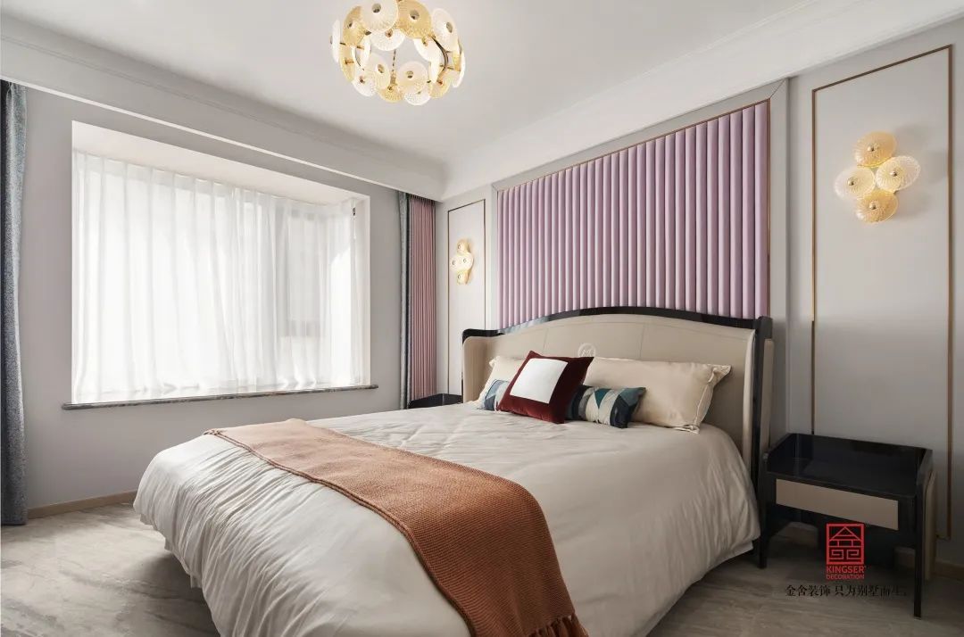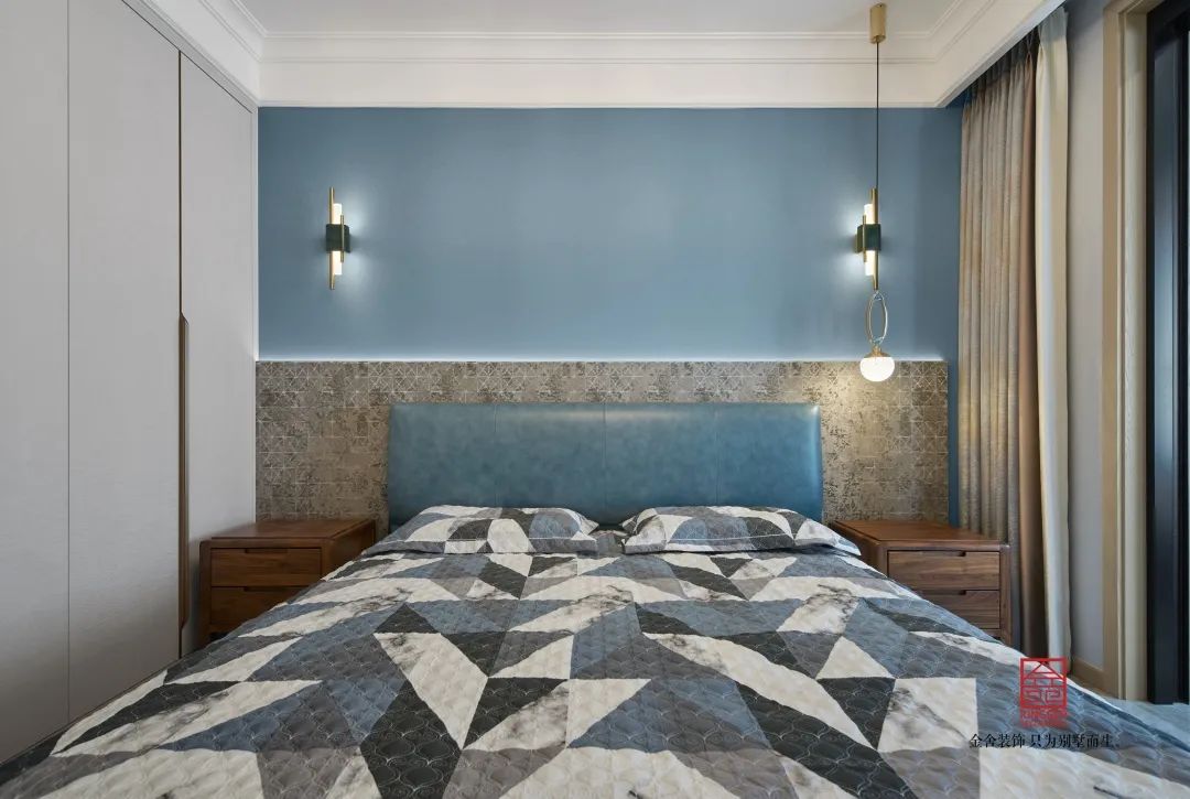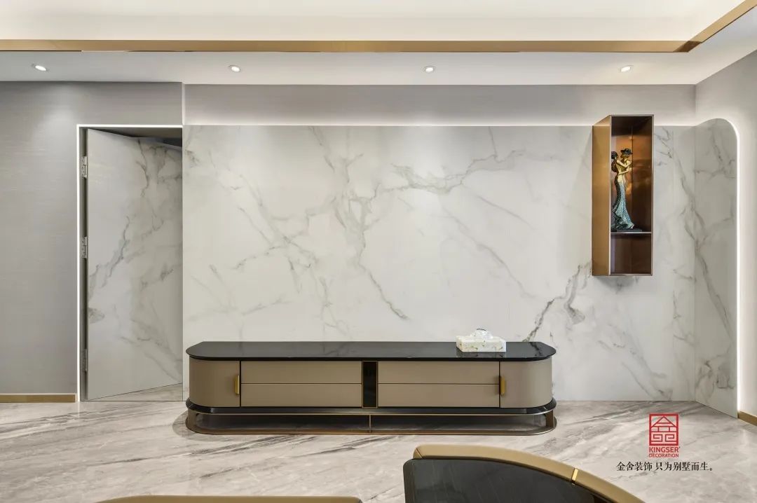 電視墻背后的巖板也是讓整個空間的格調上升了一個檔次,從品質和質感上突出最幸福的感覺。同時在電視柜的旁邊運用石材塑造出一個完美的隱形門,讓這個空間更加的時尚而雅觀。