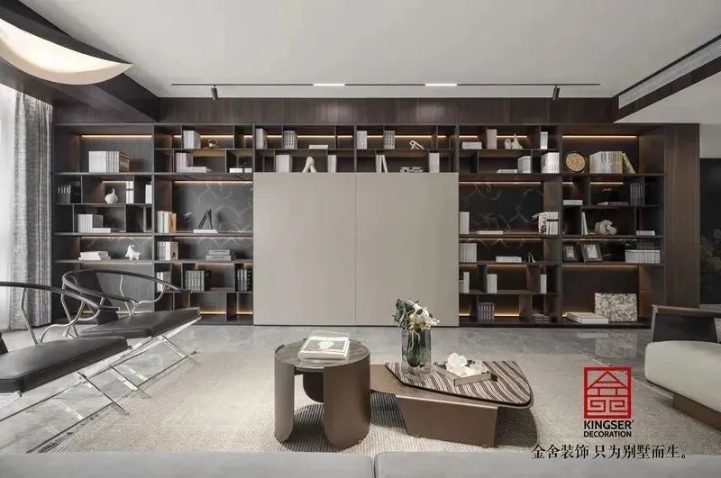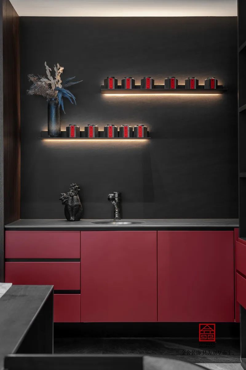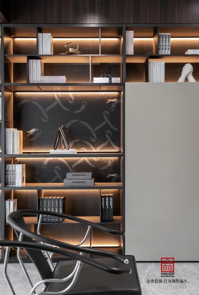 整體使用的顏色整體濃重而和諧。橫平豎直的空間線條里,質感木紋如墨色般暈染開來,木質、金屬、巖板等材質亦悄然置入,東方情韻與現代時尚的骨骼大膽融合,相得益彰。典雅高顏值,看得出設計師的優秀的能力與業主的不凡品味。