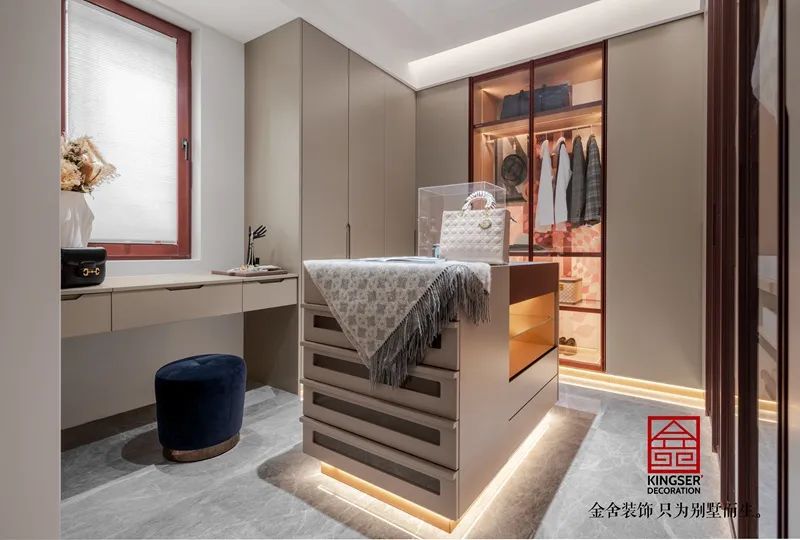 優美典雅感的水墨細描與傳統的中式家具,山水清新墻面畫作、蘊含著東方之美的“端正方整”之體態,傳統的木,傳統的風,端莊又不失風雅,窗外錯落的光影,打進來點點光束,生活莫過于此。契合女主人對于穿著和配搭的講究,特別在衣帽間的中央設置了一個中間的展示臺,一些奢侈品都可以在這里展示。同時也方便業主的取放。