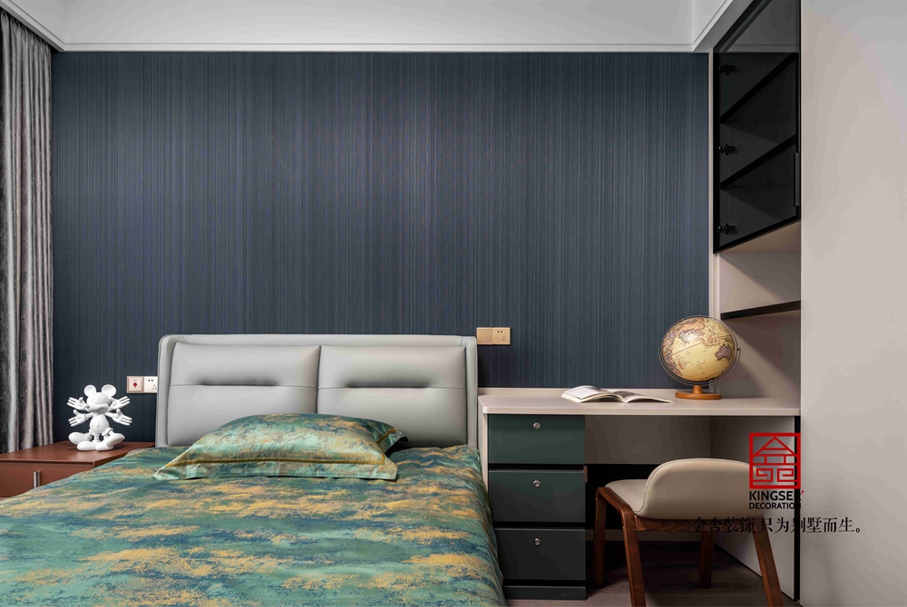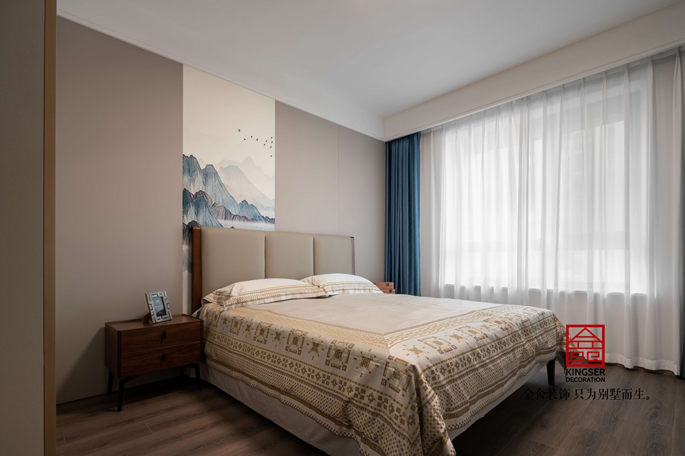 主臥采用理性的方格背景鋪陳層次,賦予空間沉穩(wěn)靜謐的基調(diào),而用材用色自然干凈又打破這一冷凝感,讓整個(gè)空間充滿舒適安然風(fēng)情。優(yōu)雅的弧形像畫(huà)筆一般輕盈游走,靈動(dòng)灑脫,使空間豐潤(rùn)有度讓人心生柔軟自然放松。