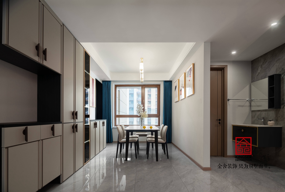 此案例為金舍裝飾-東南智匯城165平米新中式風(fēng)格裝修實(shí)景。客廳是沒(méi)有陽(yáng)臺(tái)的所以說(shuō)采光是這個(gè)戶型的比較大的一個(gè)痛點(diǎn),結(jié)合這個(gè)原因,設(shè)計(jì)師沒(méi)有用一些傳統(tǒng)的墻板來(lái)做這樣的造型,而是采用了肌理感非常強(qiáng)的維詩(shī)康的壁布來(lái)做造型,環(huán)保性非常強(qiáng),顏色的選擇也很多,本案選擇的顏色是琥珀金色,比較貼合新中式的風(fēng)格