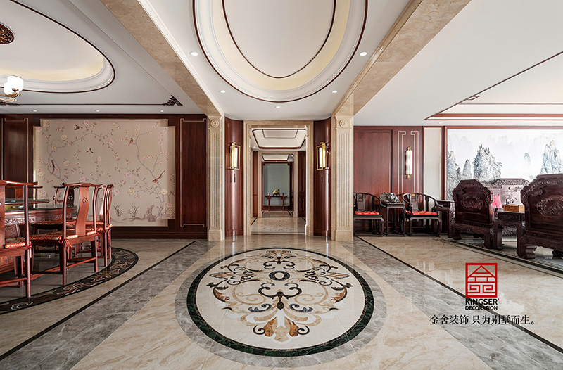 金舍裝飾-天下玉苑500平中式風格實景拍攝,奢華大氣的超大平墅,走廊長度達到17米,貫穿客餐廳,休閑區,以及三個臥室,氣宇非凡。客廳采用大紅酸枝的13件套,品質上乘,沙發細節的祥云圖案,纏枝蓮紋手工打造,茶幾的圖案選用松鶴延年,四周是梅蘭竹菊,象征著長壽和健康,也寓意著吉祥和祥瑞。