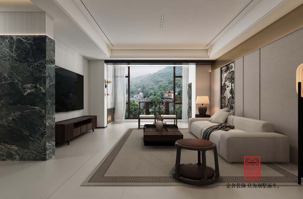 本客廳設計采用現代中式風格,旨在融合傳統中式美學與現代生活的舒適與便利,營造出一個寧靜、優雅且富有文化底蘊的空間。