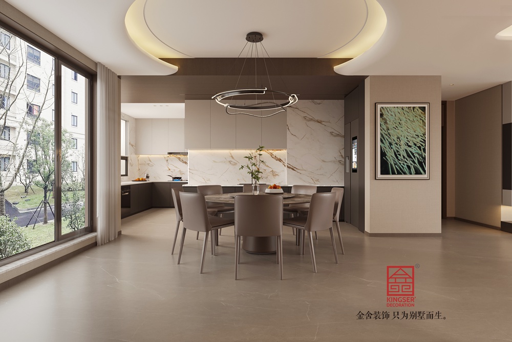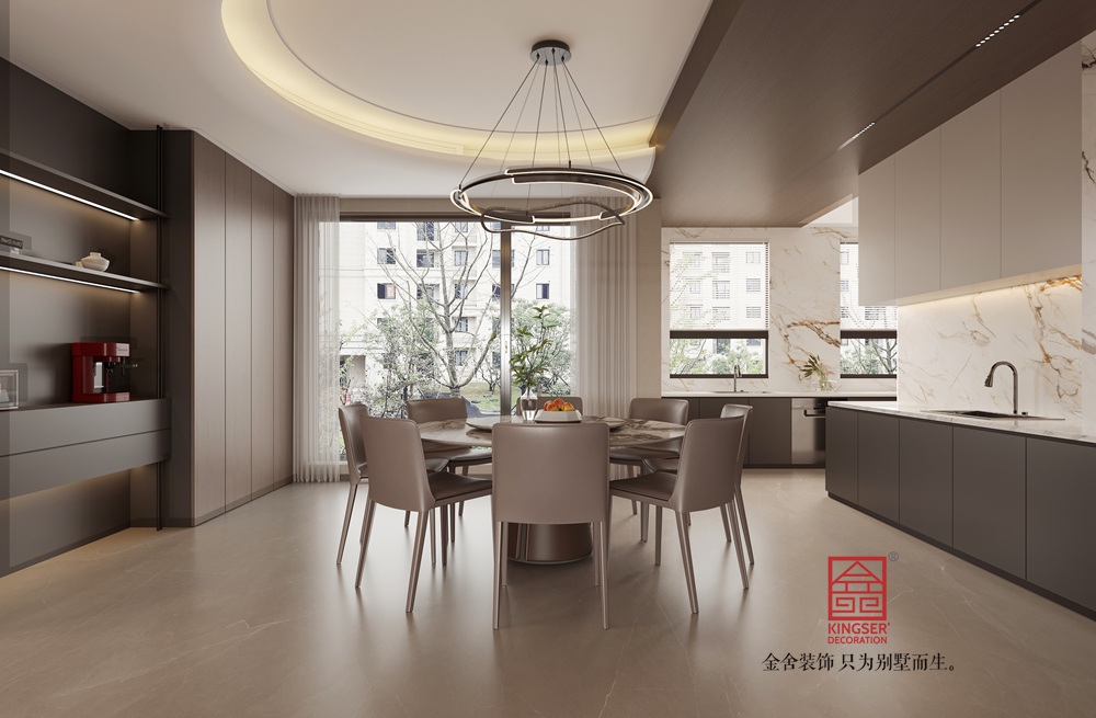 客廳優雅、沉靜及治愈的氛圍感,貫穿整個空間的動線。柔軟舒適的轉角沙發,一種愜意而高雅的生活節奏,游走于光影游離間,浸潤于日常。