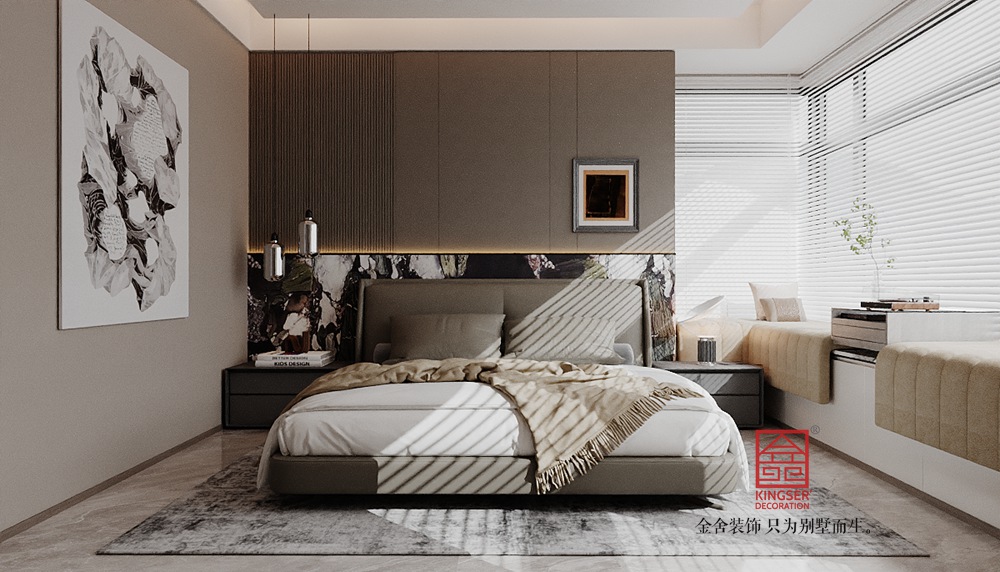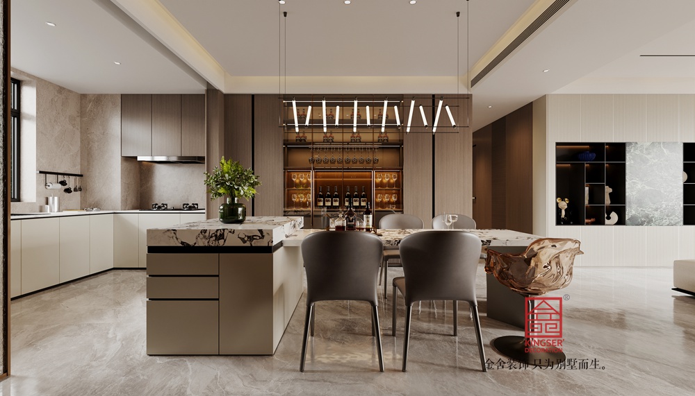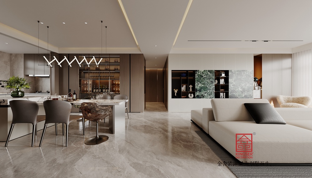 大面積落地窗引入自然光線與戶外景致,打破室內外界限。定制收納墻兼具展示與實用,石材、金屬等材質點綴,提升質感。