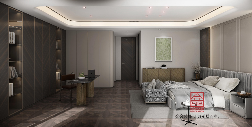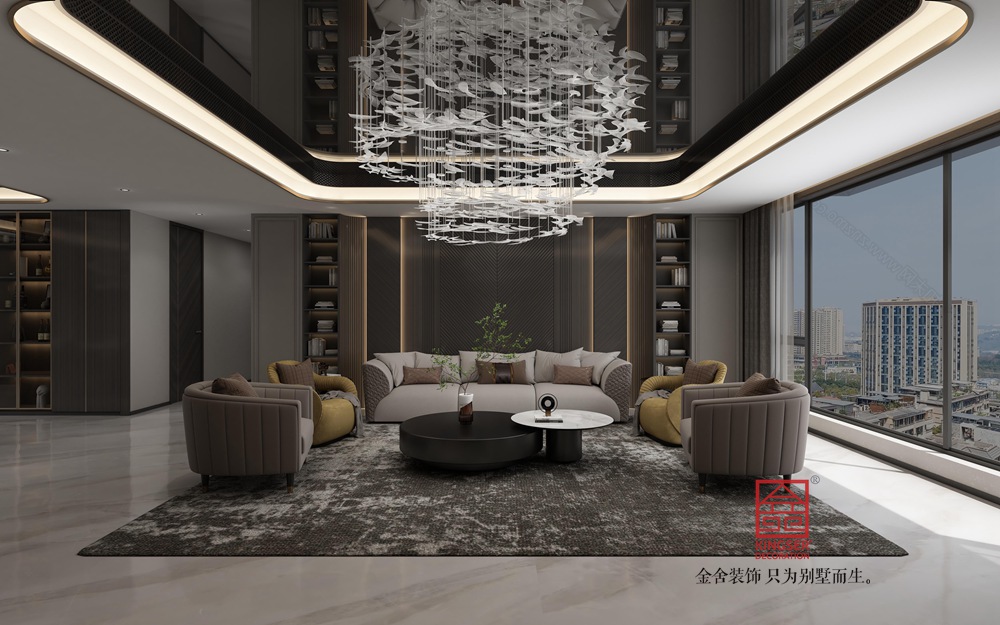 設計說明: 空間布局上,開放式格局連通視覺,大窗引入城市景觀,拓展視野與采光。頂面采用懸浮吊頂,搭配線性燈光,結合藝術感十足的白色創意吊燈,塑造精致氛圍。墻面以深灰為主調,電視背景墻用金屬線條勾勒,強化輕奢質感,兩側深色木質護墻增添層次。