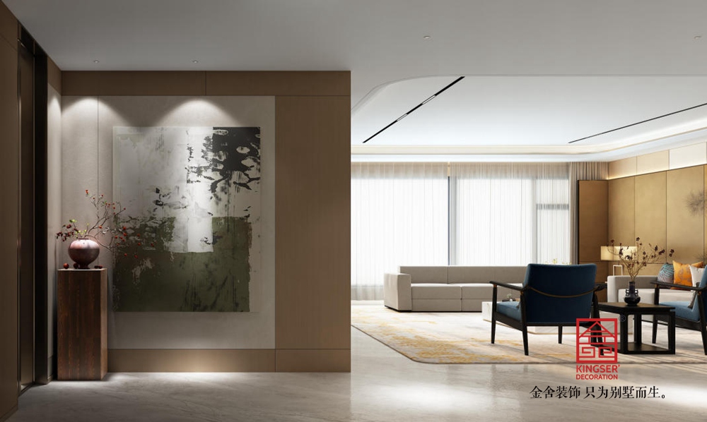 該客廳設計為新中式風格,融合傳統韻味與現代簡約。以淺米、暖棕為主色調,營造溫潤雅致氛圍。頂面懸浮式造型搭配線性燈,簡潔大氣又具層次感。