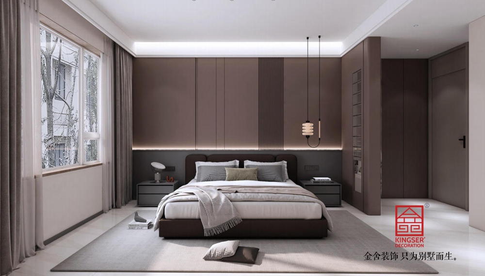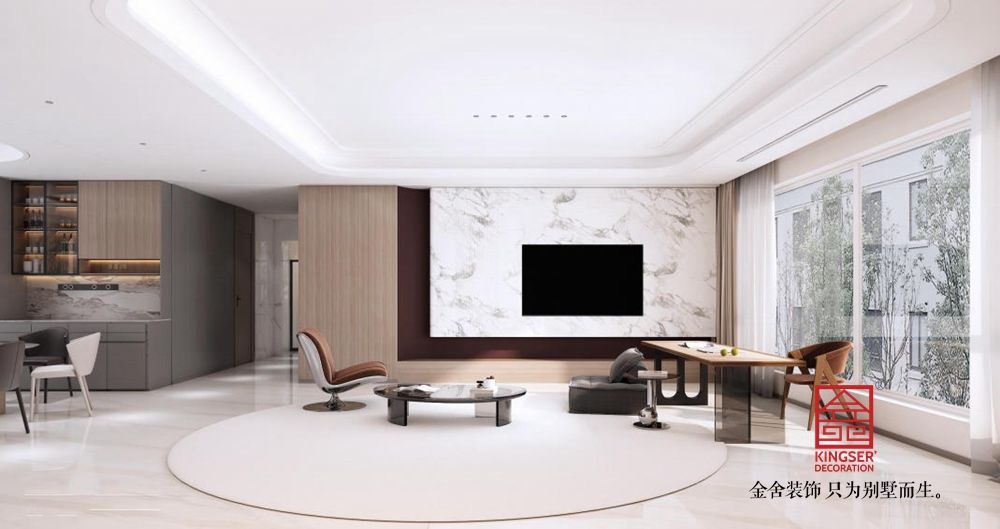 空間布局上,開放式格局讓交流無界。大幅落地窗引入充足自然光線,借景戶外綠意,延伸空間視野。