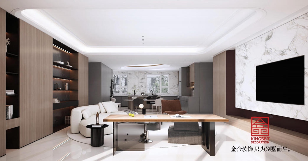 材質運用多元且和諧,溫潤木飾面營造溫馨基底,搭配石材、金屬,增添質感層次。懸浮式收納墻兼具實用與展示功能,暗藏燈帶勾勒輪廓,提升精致度。