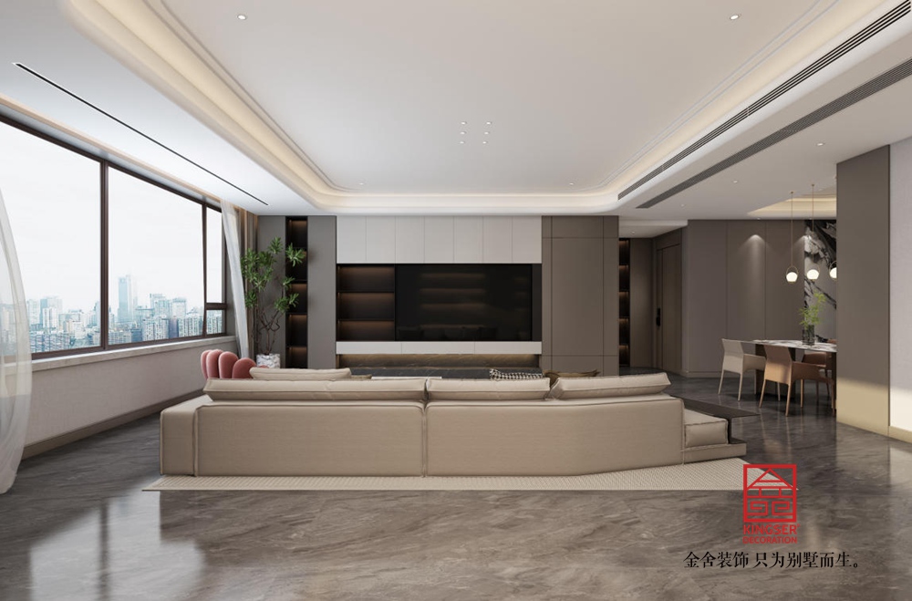 空間布局上,采用開放式設計,讓客廳與周邊區域自然銜接,增強了空間的通透感與互動性。大面積的落地窗是設計亮點,引入充足自然光線,同時將城市景觀納入室內,使空間與外界環境有機融合。