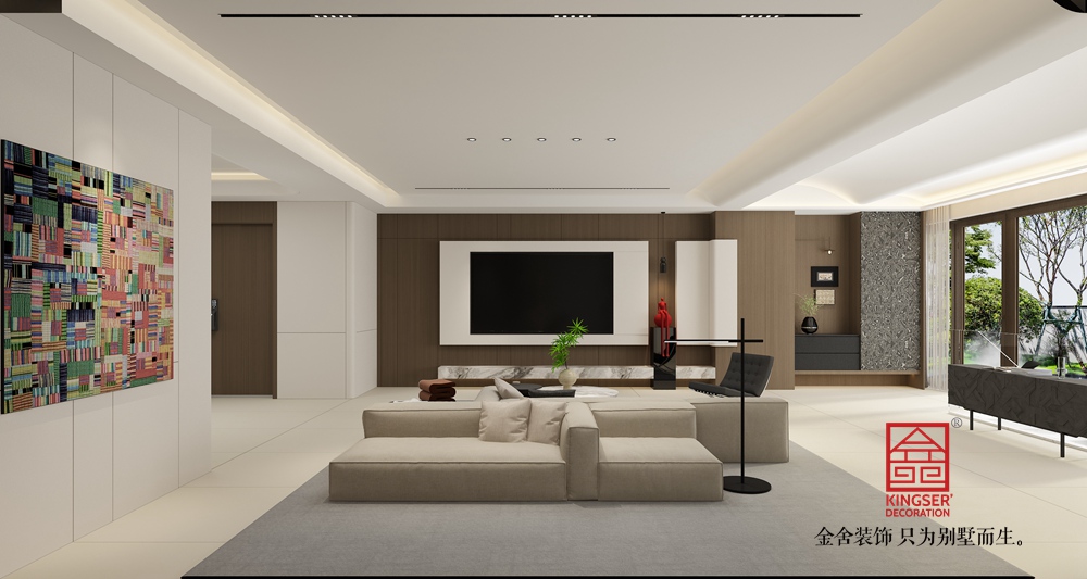 布局上,寬敞的米色組合沙發提供了舒適的休憩區域,圍繞著電視背景墻展開,形成核心交流空間。背景墻設計簡潔大方,嵌入式電視與周圍裝飾和諧相融。 裝飾細節頗具巧思,左側色彩豐富的藝術畫作,為空間注入活力與藝術氣息;角落的綠植和獨特擺件,點綴出自然生機與個性品味。