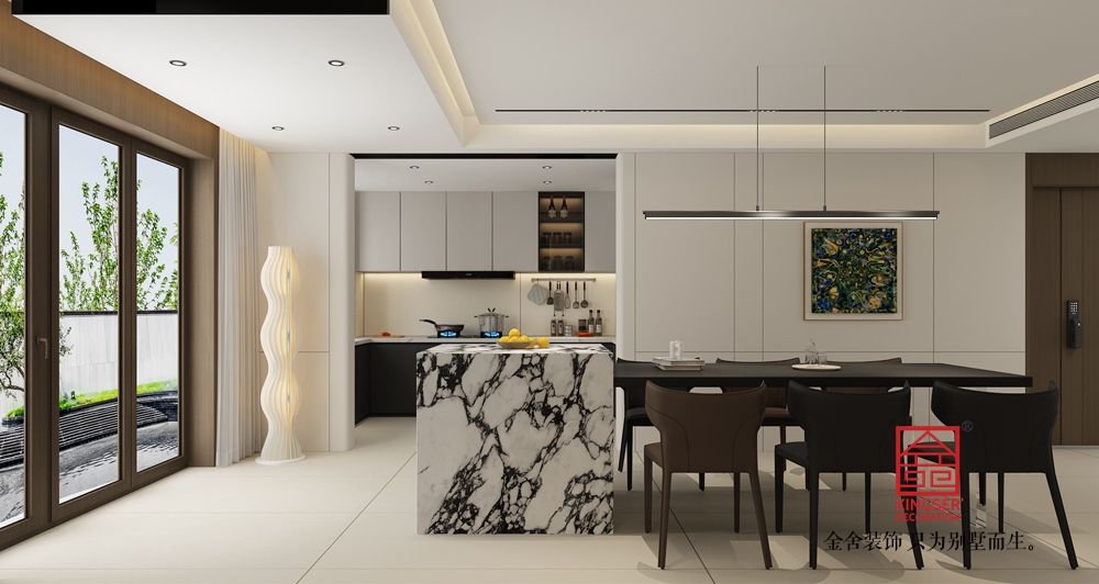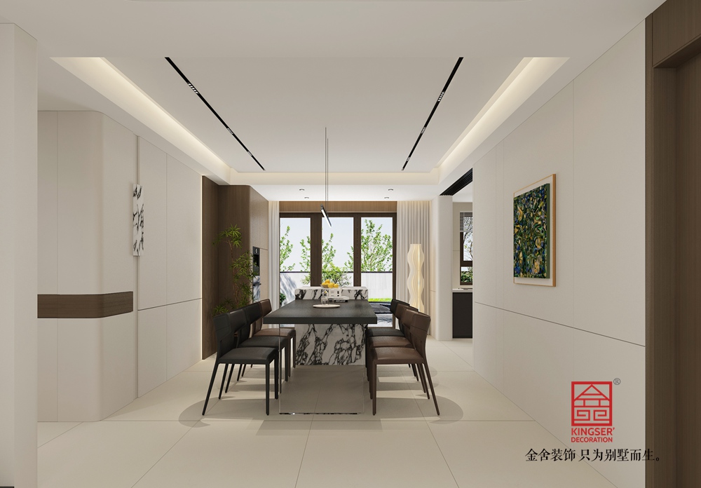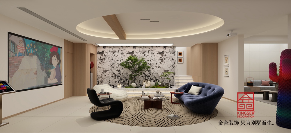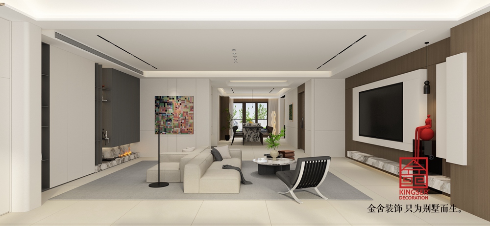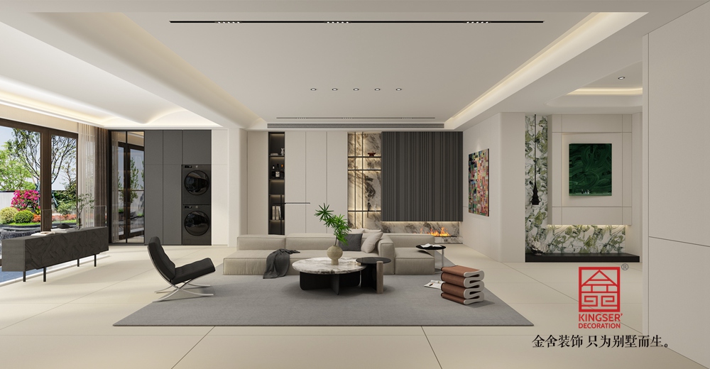此案例為石家莊別墅裝修-嘉禾名著500平米意式極簡風格裝修效果圖。本客廳設計秉持現代簡約理念,致力于打造大氣、舒適且具藝術感的空間。