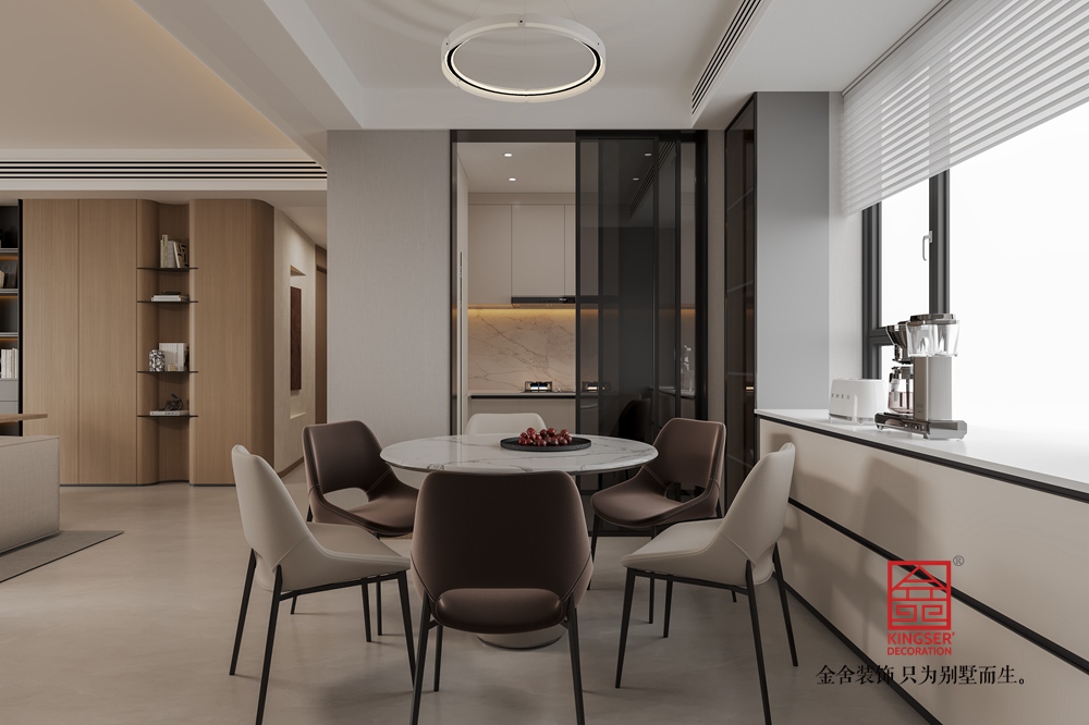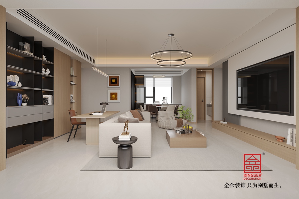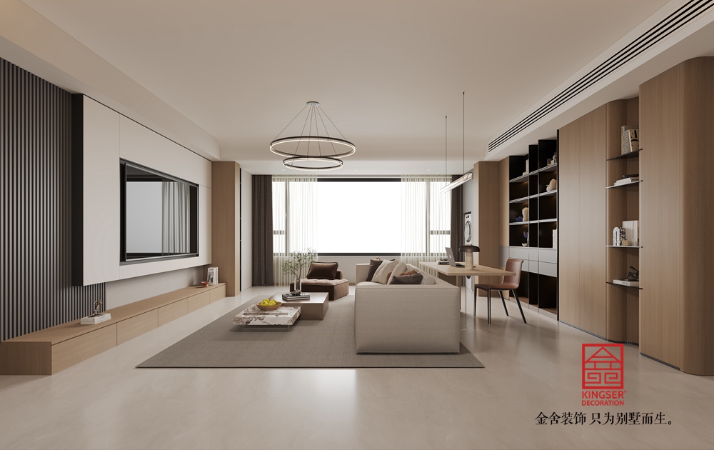 本客廳設(shè)計(jì)以現(xiàn)代簡(jiǎn)約風(fēng)格為核心,主打溫暖柔和的大地色系。空間布局上,將休閑與功能區(qū)巧妙融合,背景墻處的柜體設(shè)計(jì),兼具收納與展示功能,燈光點(diǎn)綴更顯精致。家具選擇注重舒適與質(zhì)感,淺米色大沙發(fā)搭配棕色系單品,營造出溫馨和諧的氛圍。雙層環(huán)形吊燈造型別致,為空間增添時(shí)尚感。整體通過材質(zhì)、色彩與燈光的搭配,打造出一個(gè)舒適、雅致且充滿生活氣息的別墅起居空間。