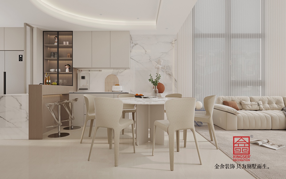 空間上,挑高設計搭配大面積玻璃窗,充分引入自然光線,讓室內外景觀相互交融,極大地拓展了視覺空間感。家具選擇注重線條的簡潔流暢與材質的柔和質感,米白色沙發、弧形單人椅等,造型簡約又不失優雅,為空間增添了溫馨感。
