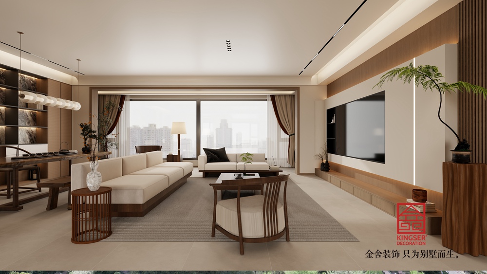 空間布局上,通過開放式的格局與通透的大窗,讓自然光線充分涌入,搭配中式掛畫、精致擺件以及綠植點(diǎn)綴,營造出“室有山林趣”的意境,盡顯宋氏美學(xué)中對自然意趣與人文情懷的追求,使整個空間成為一處可賞、可居、可靜思的雅致居所。