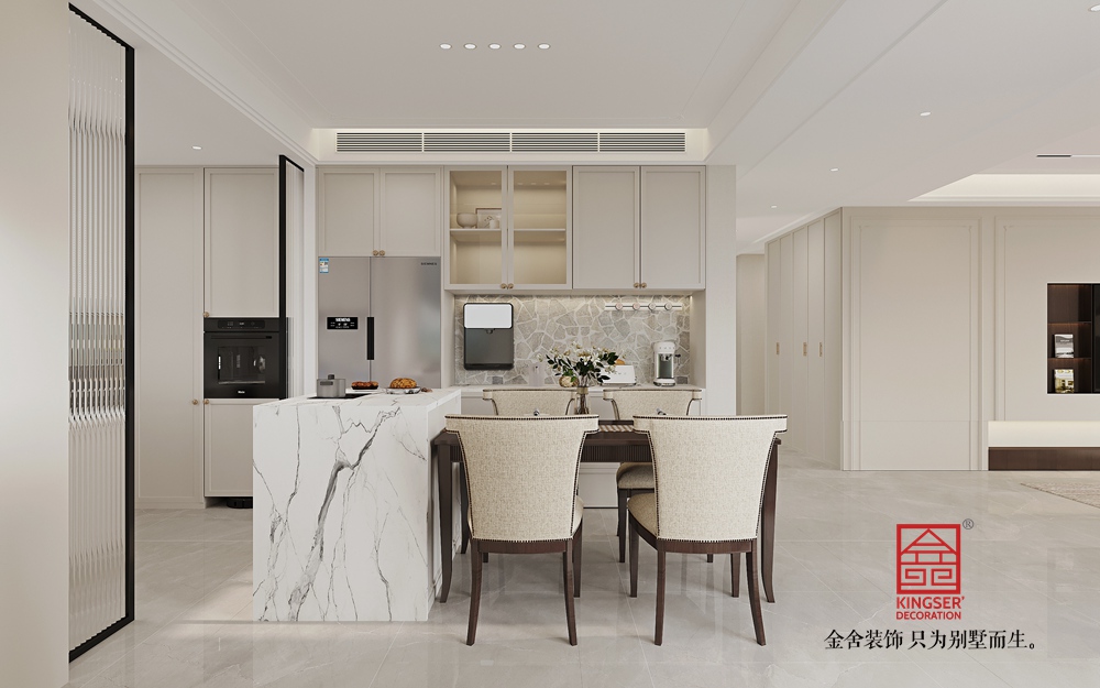 空間以柔和的暖色調為主,墻面的護墻板設計,帶有美式風格典型的線條感與立體感,細膩的雕花元素,為空間注入復古韻味,同時又通過簡潔的造型,契合現代審美。