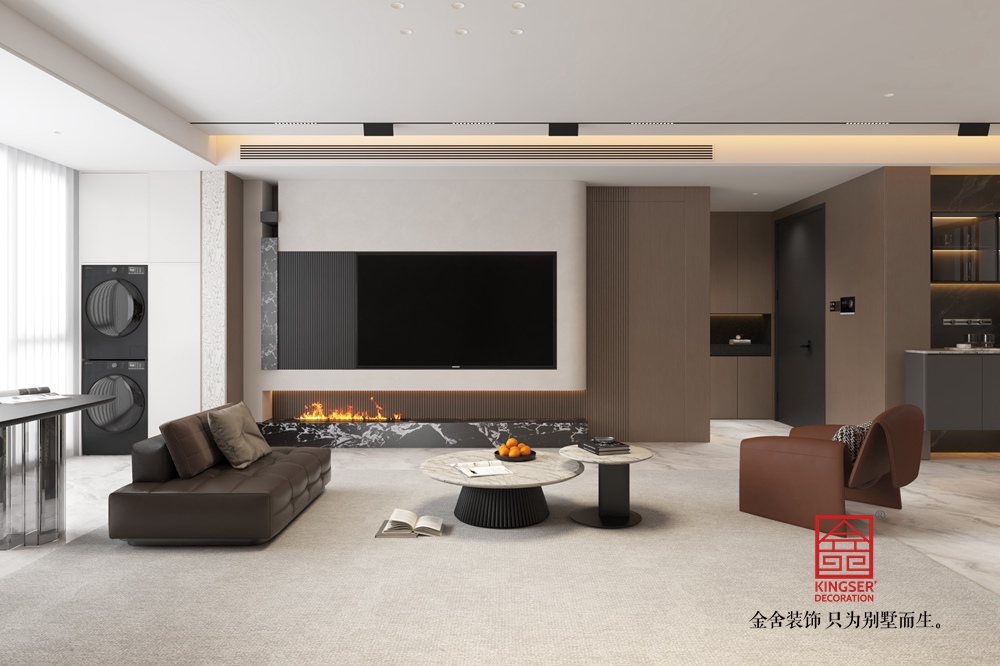 電視背景墻采用多層次設計,上方嵌入式大屏電視與下方仿真火焰壁爐形成視覺焦點,大理石紋理的壁爐基座增添奢華感,兩側的格柵與石材元素則豐富了立面層次。客廳家具選擇極簡主義單品,深棕皮質沙發的利落線條、大理石圓形茶幾的精致造型,既保證了舒適的使用體驗,又強化了空間的現代感。