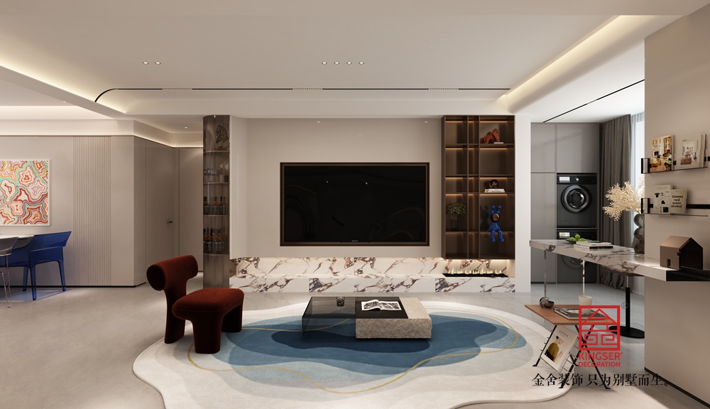 設計說明:這個客廳以 “現代輕奢 + 簡約松弛” 為核心調性,采用開放式格局銜接客餐廳與家政區,用通透玻璃柜做軟隔斷,既保障空間通透感又兼顧收納展示功能;主色調以低飽和米白、淺灰鋪陳,搭配大理石地臺的自然紋理與金屬線條點綴,再以紅色單人椅、藍色餐椅作跳色提亮,質感與靈動感兼具;細節上,懸浮電視柜 + 嵌入式燈光弱化厚重感,家政區藏于柜面后實現功能與美觀的平衡,異形地毯與藝術掛畫則為簡約空間注入藝術氛圍,整體呈現出 “好看又好住” 的輕奢質感,適配追求精致與松弛生活的需求。