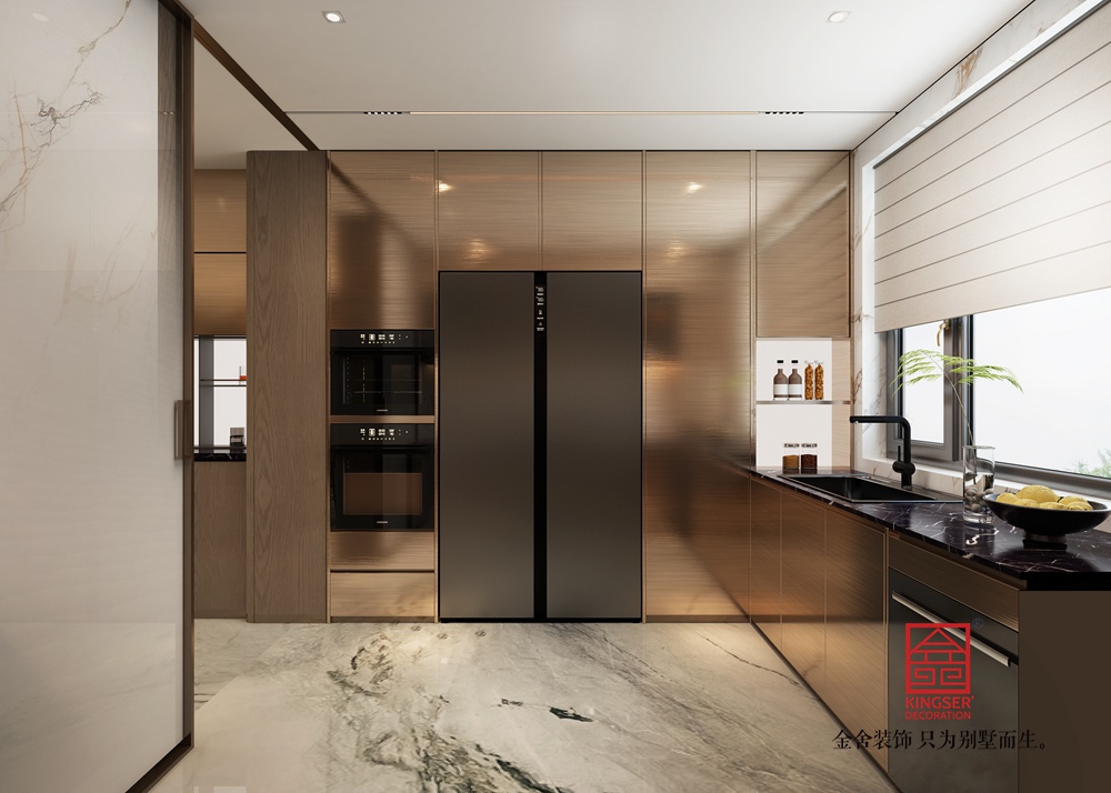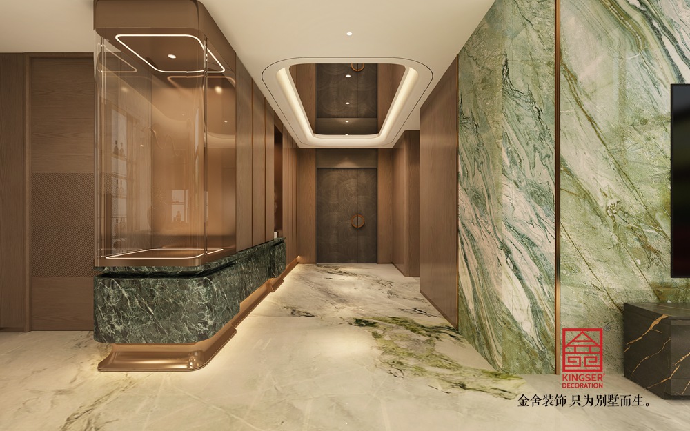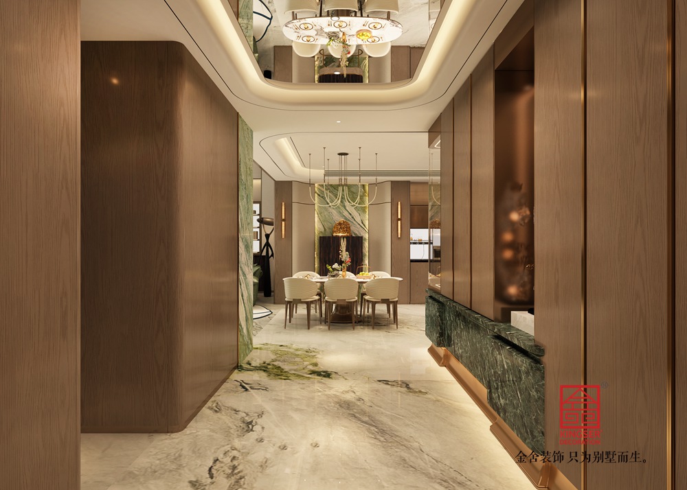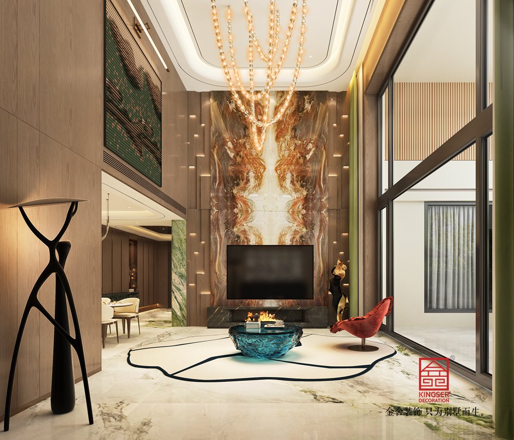 設計說明:這個空間以 “奢雅東方 × 現代奢華” 為設計內核,以溫潤木飾面與大理石紋理鋪陳自然質感基底,主墻面選用對稱式金色紋理大理石,借天然肌理的華麗張力營造視覺重心;頂部懸浮式吊頂搭配水晶枝形吊燈,輔以嵌入式燈光層疊出柔和光暈,強化空間的精致氛圍感;軟裝則以藍綠色藝術茶幾、紅色單人椅形成色彩點睛,搭配雕塑感落地燈與藝術擺件,在東方雅致與現代奢華的平衡中,構建出兼具格調與舒適的高階居住空間。