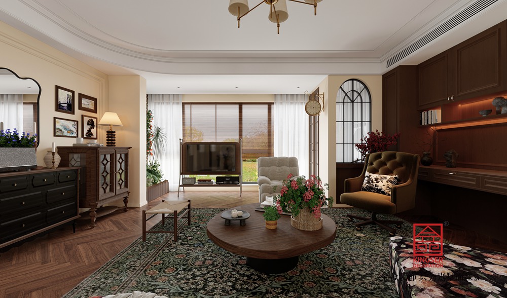 這個(gè)空間采用復(fù)古輕奢 + 暖調(diào)治愈的設(shè)計(jì)風(fēng)格,以深棕木作與暖米色墻面為基底,融入法式弧形吊頂、格紋門窗等細(xì)節(jié),既保留復(fù)古優(yōu)雅的質(zhì)感,又通過(guò)人字拼木地板增添溫暖肌理;軟裝搭配上,以繁花圖案沙發(fā)、復(fù)古綠單人椅呼應(yīng)濃郁的復(fù)古氛圍,搭配花紋地毯與鮮活花藝,柔化空間厚重感;功能區(qū)通過(guò)通頂收納柜實(shí)現(xiàn)整潔與展示兼具的效果,而黃銅吊燈、藝術(shù)擺件則提升精致度,整體既呈現(xiàn)出復(fù)古格調(diào)的松弛氛圍,又適配日常休閑與社交的多元需求。