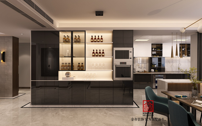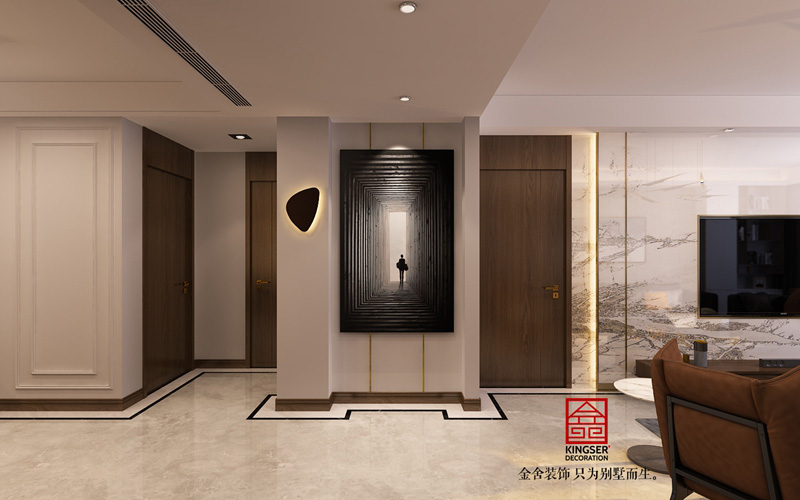 此方案業主為年輕新婚夫婦,對新家有無限的美好憧憬,所以在出設計方案的時候更注重顏色以及燈光的舒適度。沒有做太多復雜的造型,只是用天然石材以及護墻板的木紋紋理來襯托出現在風格的時尚氣息。地面瓷磚的鋪貼方式也沒有采用傳統的分空間區域的方式來做造型拼花,而是采用了對工人師傅施工工藝要求很高的波導線繞墻鋪貼方式,這樣從視覺感上擴大了整個空間的空間感。這樣也不會限制家具擺放的位置,后期家具進場后可以根據業主自己的使用喜歡擺放不同的角度。