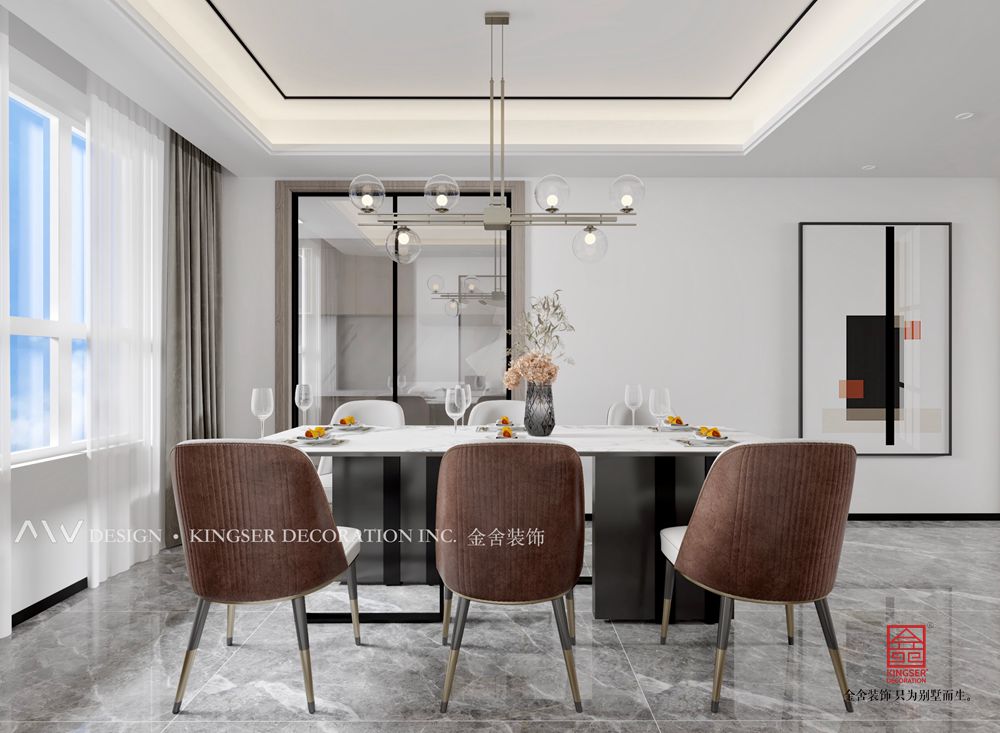 餐廳沿襲客廳原木與純白的色調搭配,布藝餐椅給空間增添了一抹古樸的自然,原木方桌配置圍合起就餐的溫度與禮序。圓形掛畫點綴其中,為空間注入一股明媚,生氣悠長。