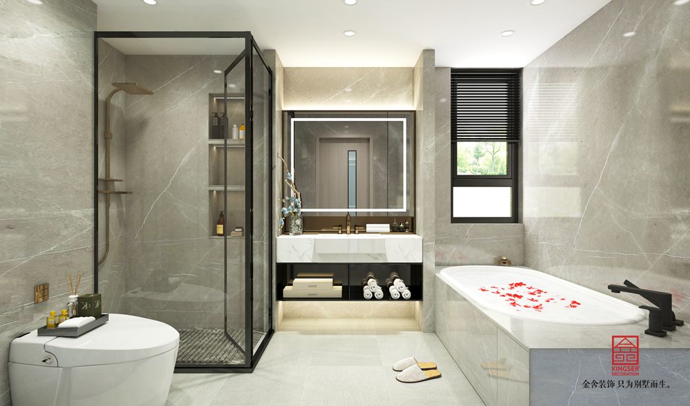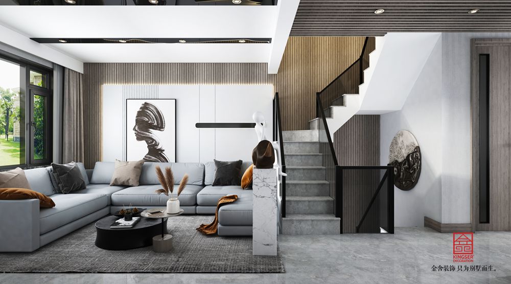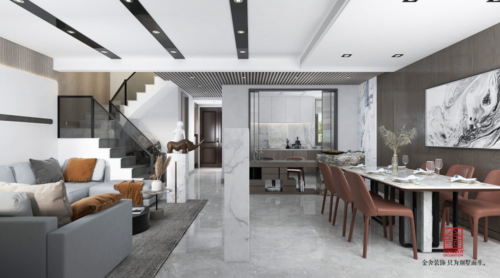 金舍裝飾-中央云著246平米現(xiàn)代簡(jiǎn)約風(fēng)格裝修效果圖。大理石質(zhì)感鋪滿了整個(gè)電視墻,在木質(zhì)壁掛電視柜與電視機(jī)的烘托下,結(jié)合舒適現(xiàn)代的布藝沙發(fā),木質(zhì)打造的收納展示沙發(fā)墻,整個(gè)空間都透露著一股舒適自然的氣息。