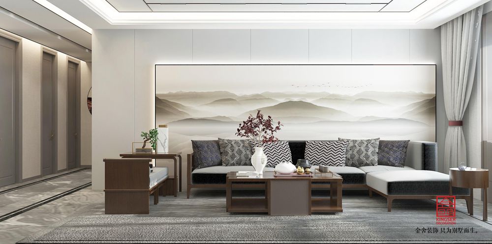 客廳:主要黑白灰配中式原木家具裝飾,吊頂運用簡單的平頂以極窄黑色線條勾勒,時尚的屏風起空間分離作用,并且時尚造型很有裝飾感,沙發背景是一整幅山水畫的效果起點睛效果.