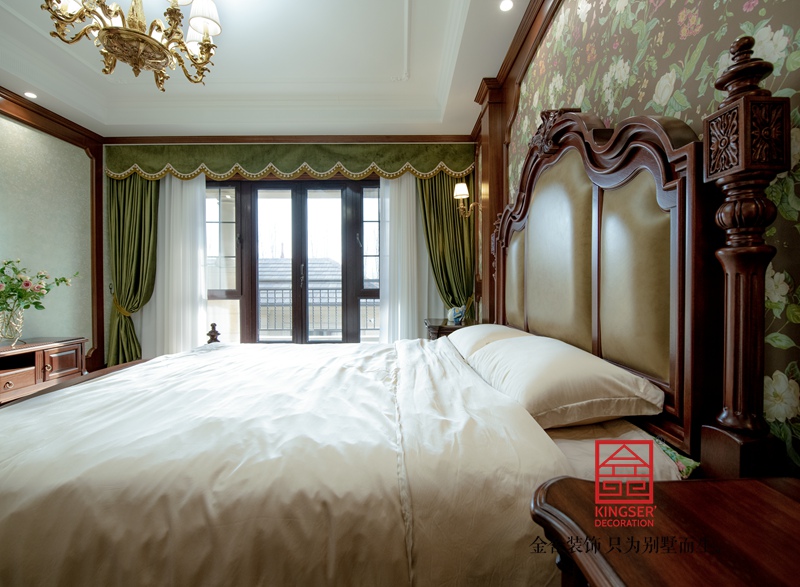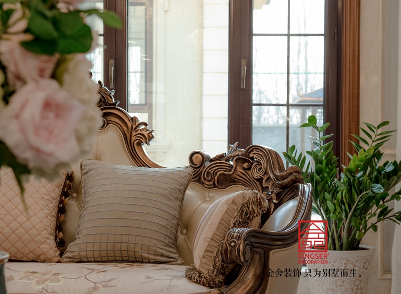 一樓客廳多用淺灰色瓷磚,用拼花分割區域,墻面用米色石材鏤空墻板,頂面加入法式線條及法式雕花燈盤顏色明亮線條優美靈動。家具是美式實木質地以法式形態展現創新不失莊重。