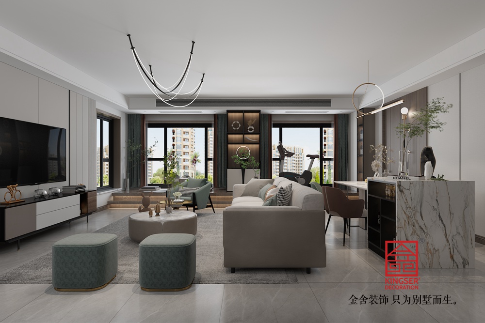 本案為金舍裝飾-北城國際170平米現代簡約裝修效果圖。采用幾何線條修飾,外觀簡潔流暢,立面立體層次感較強,,合理運用色塊色帶處理。體現了現代生活快節奏、簡約和實用,但又富有朝氣的生活特征,沒有過分的裝飾,從功能出發,講究生活的舒適、空間結構的明確美觀,強調外觀的簡潔、大方。