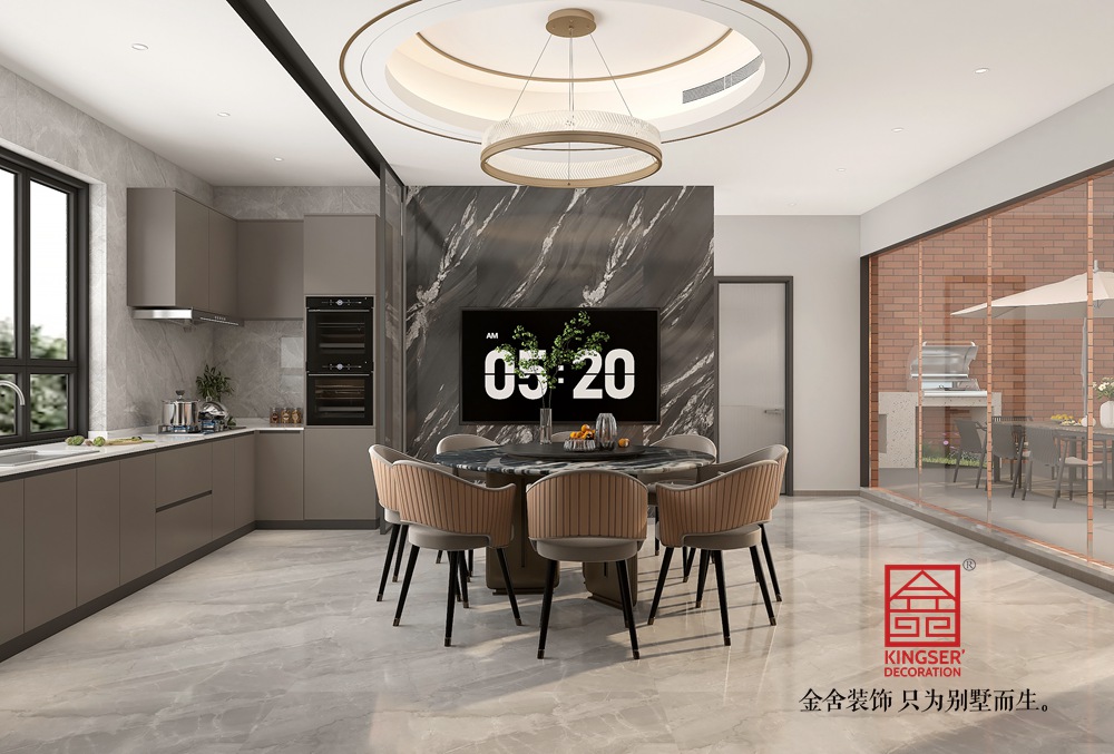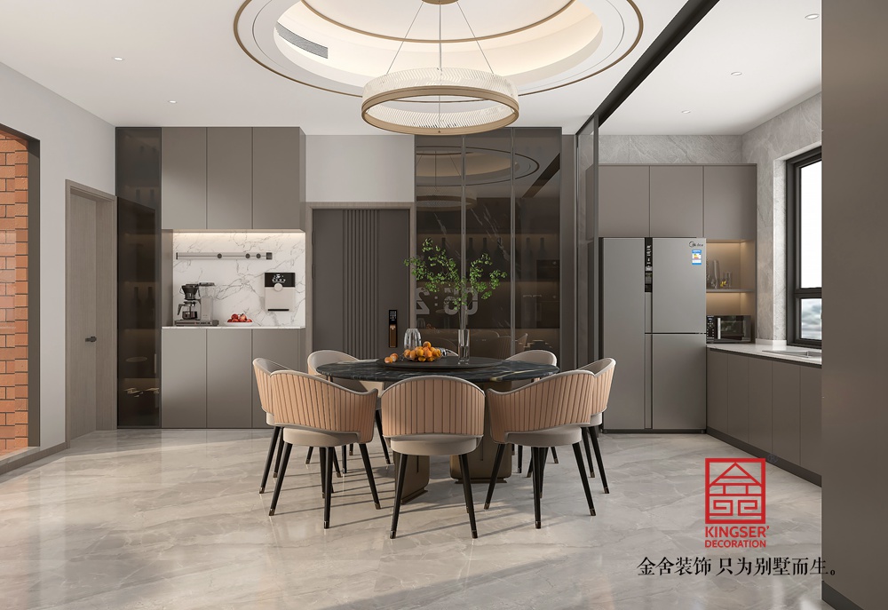 二樓起居室改餐廚一體空間,以圓形餐桌為中心的正餐廳,很好把樓上樓下的動靜空間得以劃分。搭配圓形燈池吊頂,彰顯穩(wěn)重大氣。