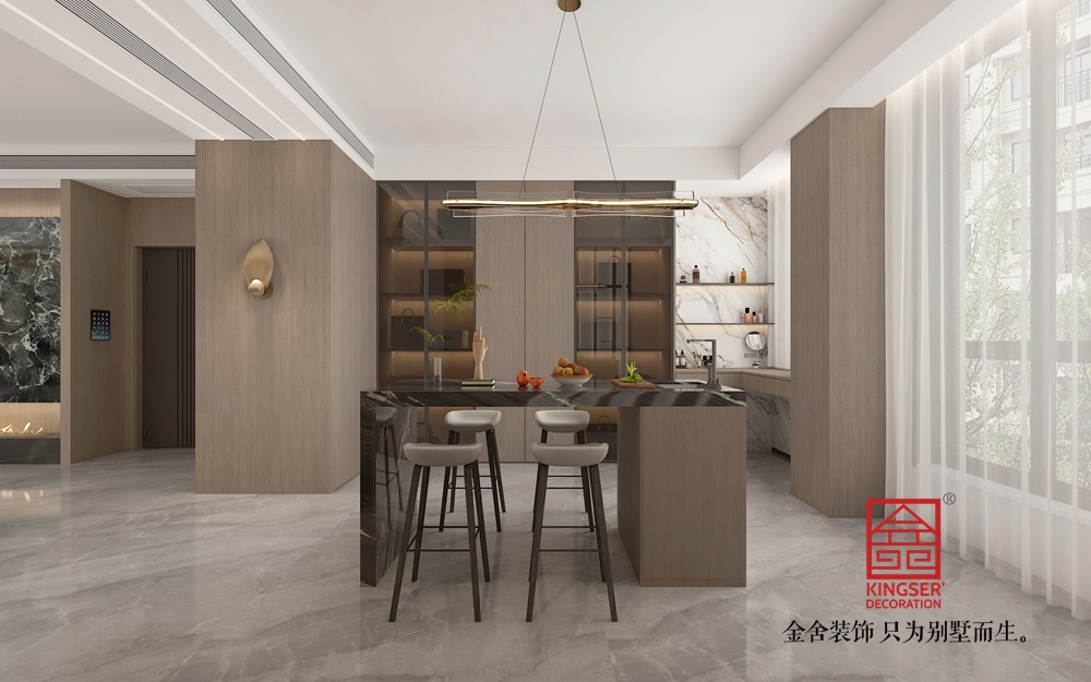 原廚房改造為衣帽間,餐廳改為茶室水吧區(qū),使得整個空間充滿張力,不拘泥于常規(guī),