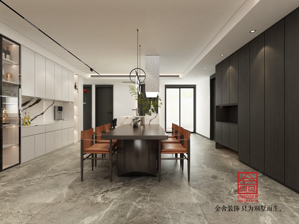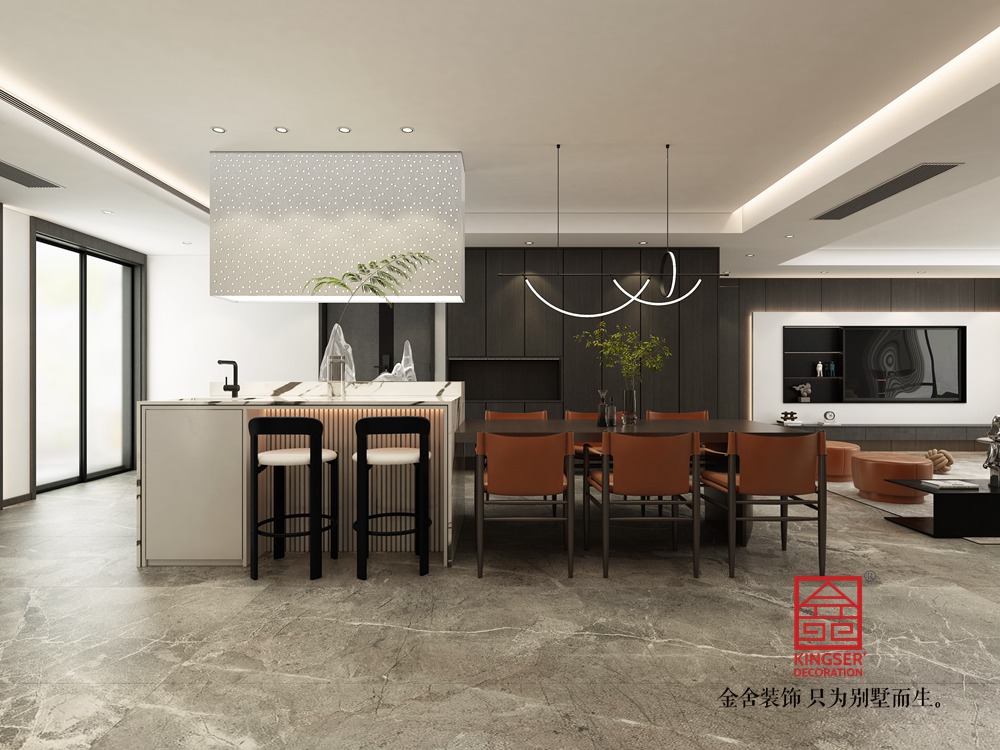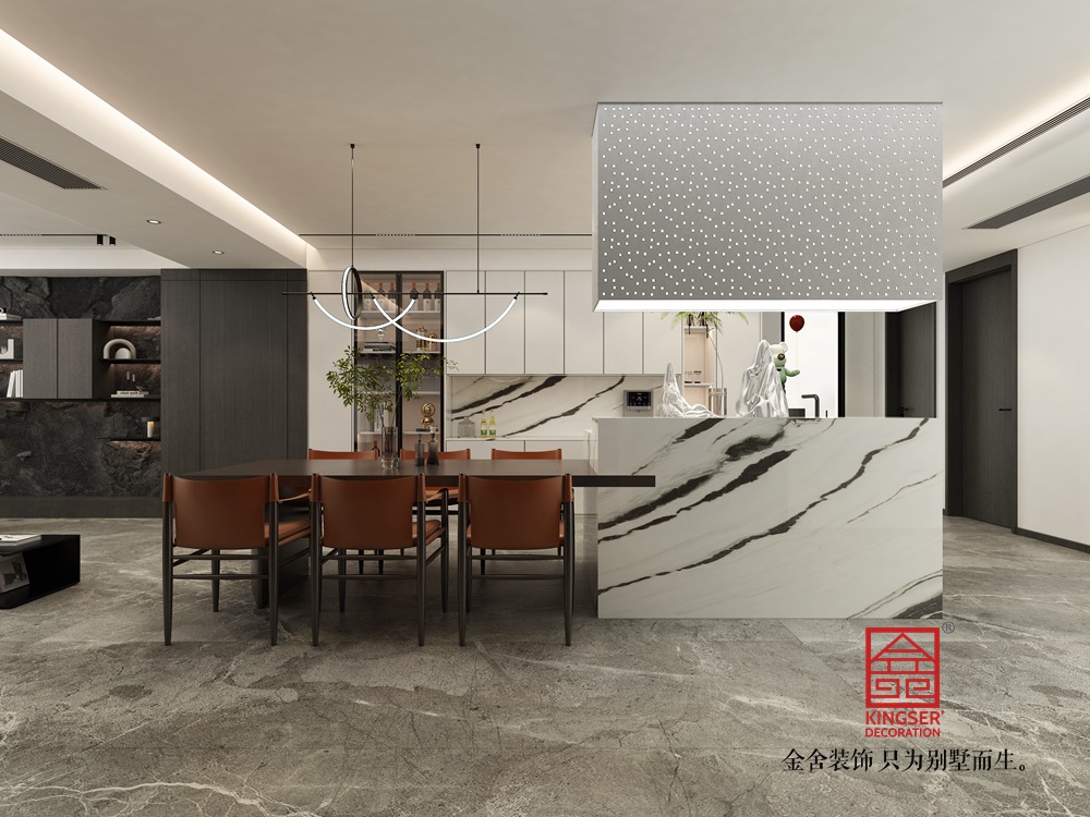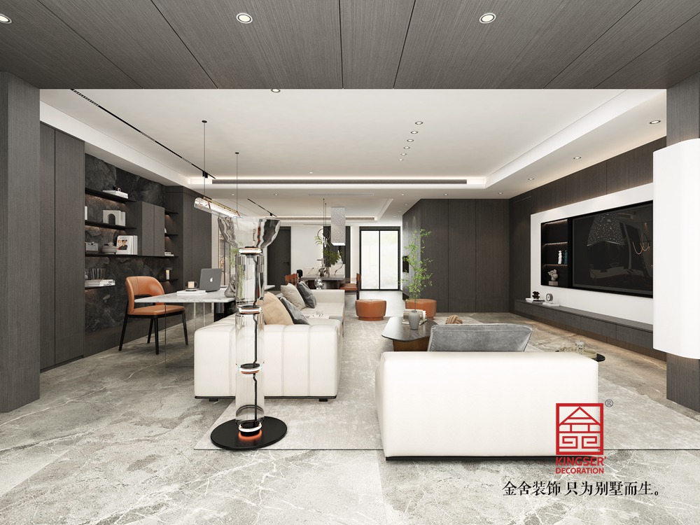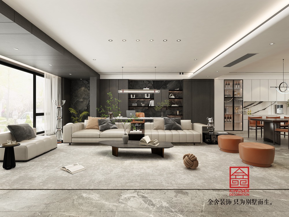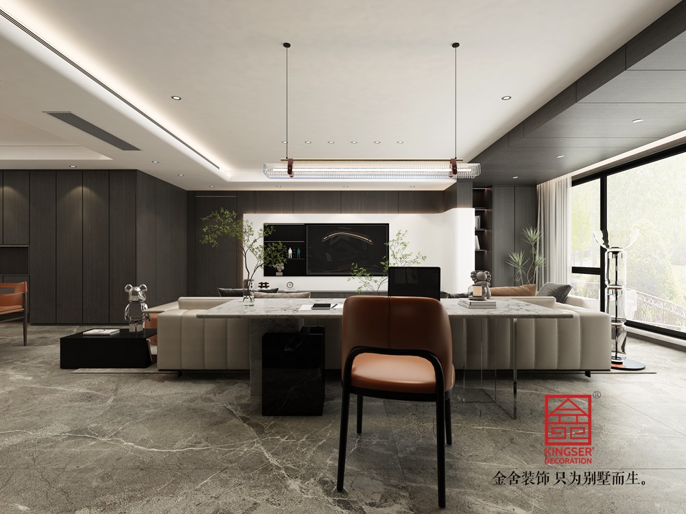 設計說明:此案例為金舍裝飾-利航棠樾府265平米意式極簡風格裝修效果圖。風格搭配上,以低飽和度色調為主打,黑白灰色的經典運用,將整體居室表現的簡單明朗充滿層次感,地板、墻面都以統一色調進行搭配,在材質與風格之間靈活應用,讓整體空間混為一體,保持高度一體化,使整個空間泛著輕奢的高級感。