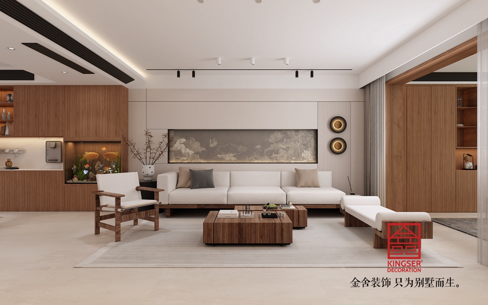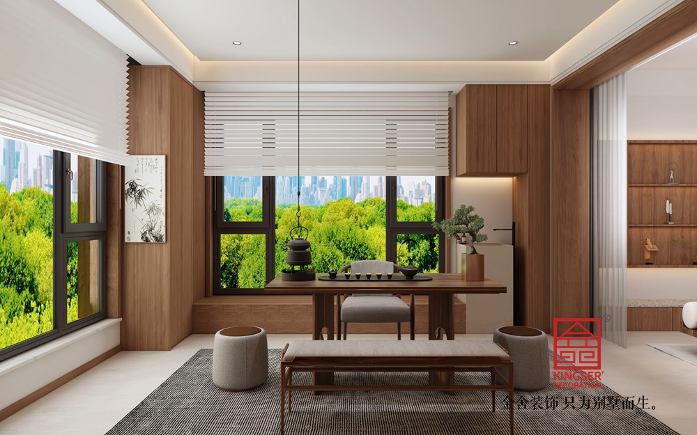 設計說明:此案例為石家莊裝修公司-國仕山150平米新中式風格裝修效果圖。風格偏中古又融合了一些中式元素,在空間上盡可能地擴大客廳活動空間,使動線流暢,平時是兩口子住,用作養老,所以在設計上盡可能地方便兩位客戶的生活,在衛生間配備養老設施,方便使用,贈送的露臺位置整體包起來了,做了一個茶室,男主人有品茶的習慣,整體結構沒有大的改動。戶型南北跨度較大,空間寬敞,整體規劃過后空間利用合理